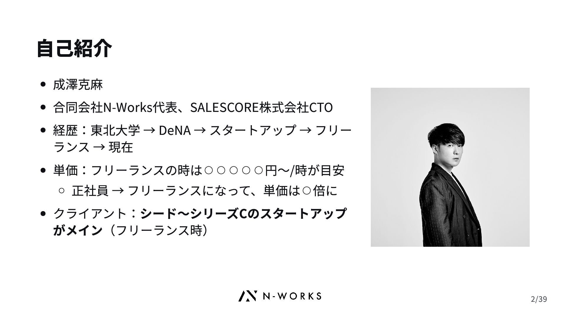 ランス → 現在 単価:フリーランスの時は⚪︎⚪︎⚪︎⚪︎⚪︎円〜/時が目安 正社員 → フリーランスになって、単価は⚪︎倍に クライアント:シード〜シリーズCのスタートアップ がメイン(フリーランス時) 2/39