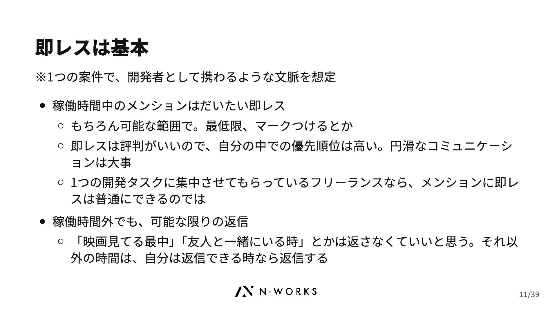 即レスは基本 ※1つの案件で、開発者として携わるような文脈を想定 稼働時間中のメンションはだいたい即レス もちろん可能な範囲で。最低限、マークつけるとか 即レスは評判がいいので、自分の中での優先順位は高い。円滑なコミュニケーシ ョンは大事 1つの開発タスクに集中させてもらっているフリーランスなら、メンションに即レ スは普通にできるのでは 稼働時間外でも、可能な限りの返信 「映画見てる最中」