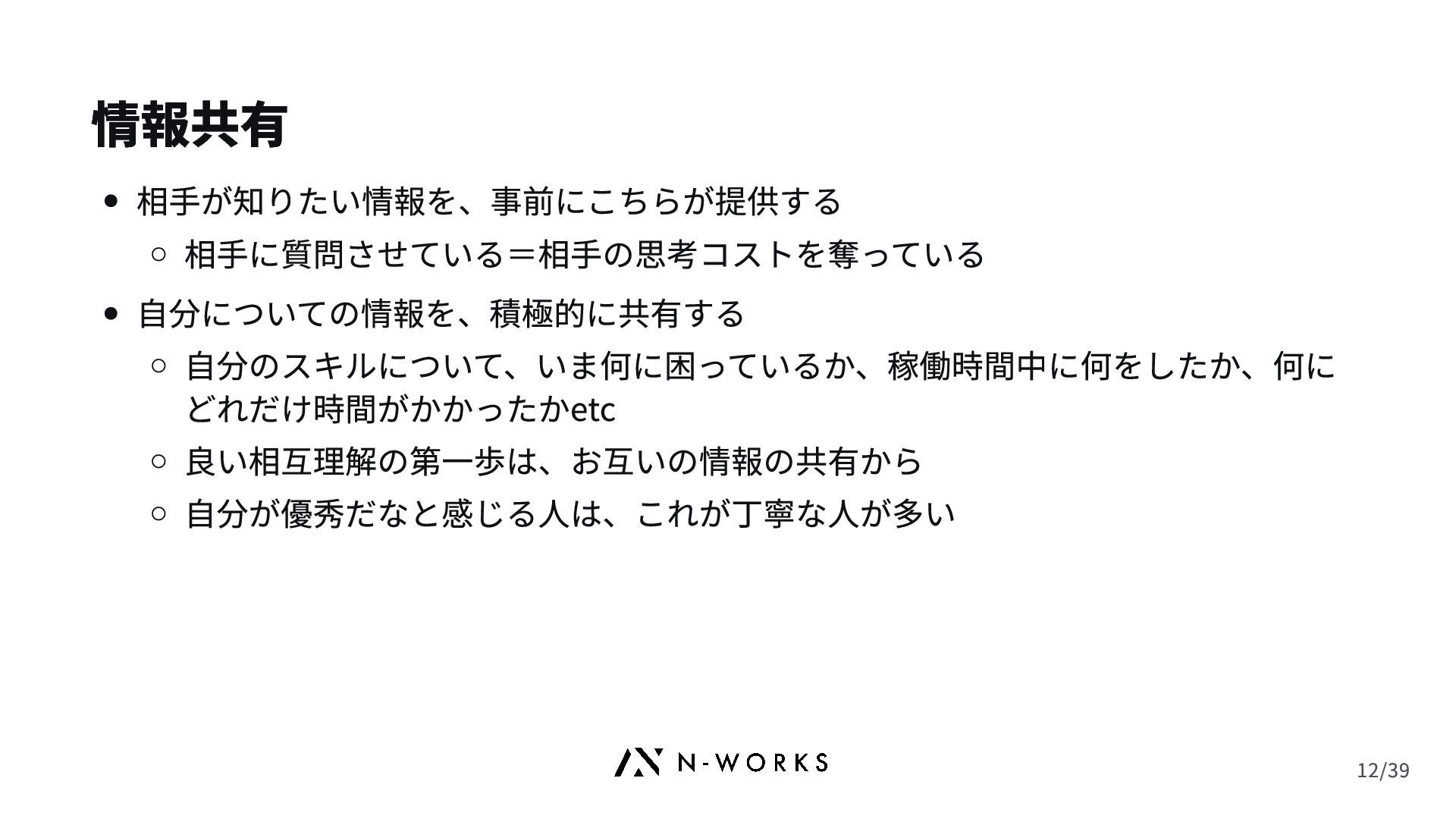 情報共有 相手が知りたい情報を、事前にこちらが提供する 相手に質問させている=相手の思考コストを奪っている 自分についての情報を、積極的に共有する 自分のスキルについて、いま何に困っているか、稼働時間中に何をしたか、何に どれだけ時間がかかったかetc 良い相互理解の第一歩は、お互いの情報の共有から 自分が優秀だなと感じる人は、これが丁寧な人が多い 12/39