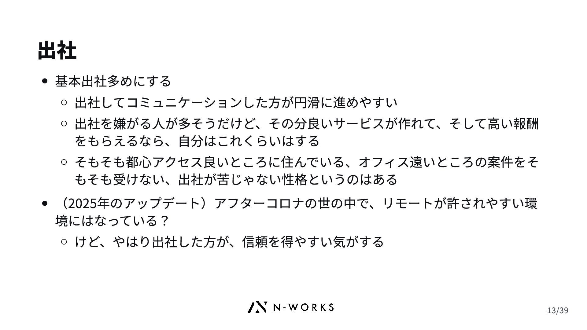 出社 基本出社多めにする 出社してコミュニケーションした方が円滑に進めやすい 出社を嫌がる人が多そうだけど、その分良いサービスが作れて、そして高い報酬 をもらえるなら、自分はこれくらいはする そもそも都心アクセス良いところに住んでいる、オフィス遠いところの案件をそ もそも受けない、出社が苦じゃない性格というのはある (2025年のアップデート)アフターコロナの世の中で、リモートが許されやすい環 境にはなっている? けど、やはり出社した方が、信頼を得やすい気がする