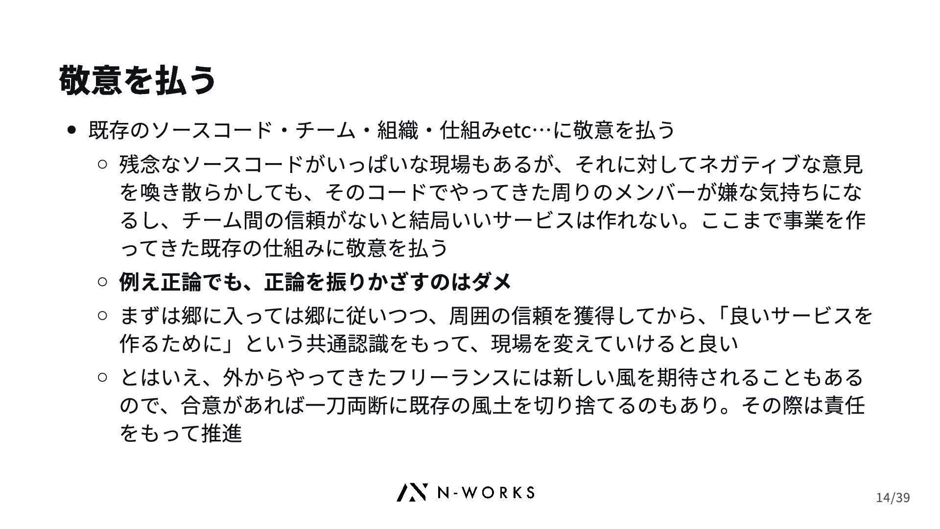 敬意を払う 既存のソースコード・チーム・組織・仕組みetc…に敬意を払う 残念なソースコードがいっぱいな現場もあるが、それに対してネガティブな意見 を喚き散らかしても、そのコードでやってきた周りのメンバーが嫌な気持ちにな るし、チーム間の信頼がないと結局いいサービスは作れない。ここまで事業を作 ってきた既存の仕組みに敬意を払う 例え正論でも、正論を振りかざすのはダメ まずは郷に入っては郷に従いつつ、周囲の信頼を獲得してから、 「良いサービスを 作るために」という共通認識をもって、現場を変えていけると良い