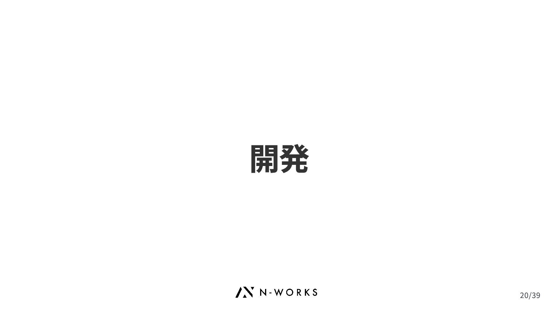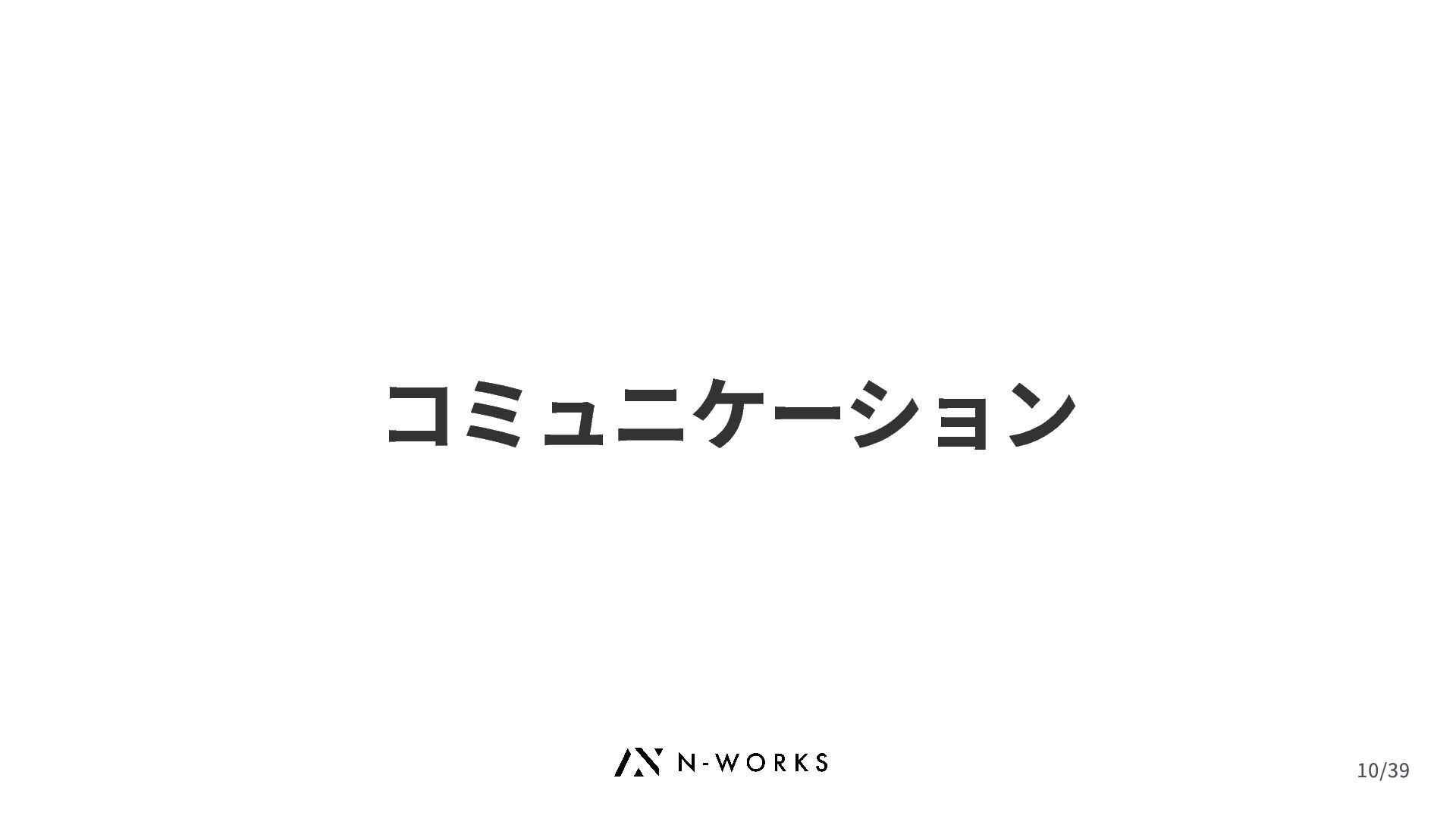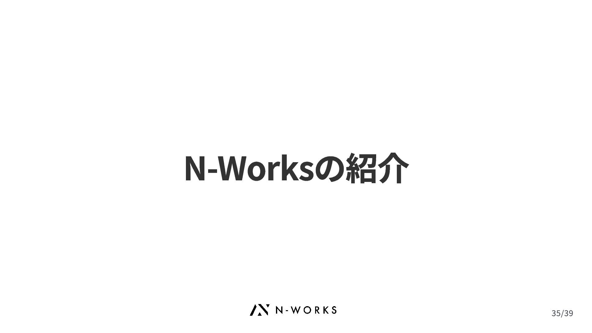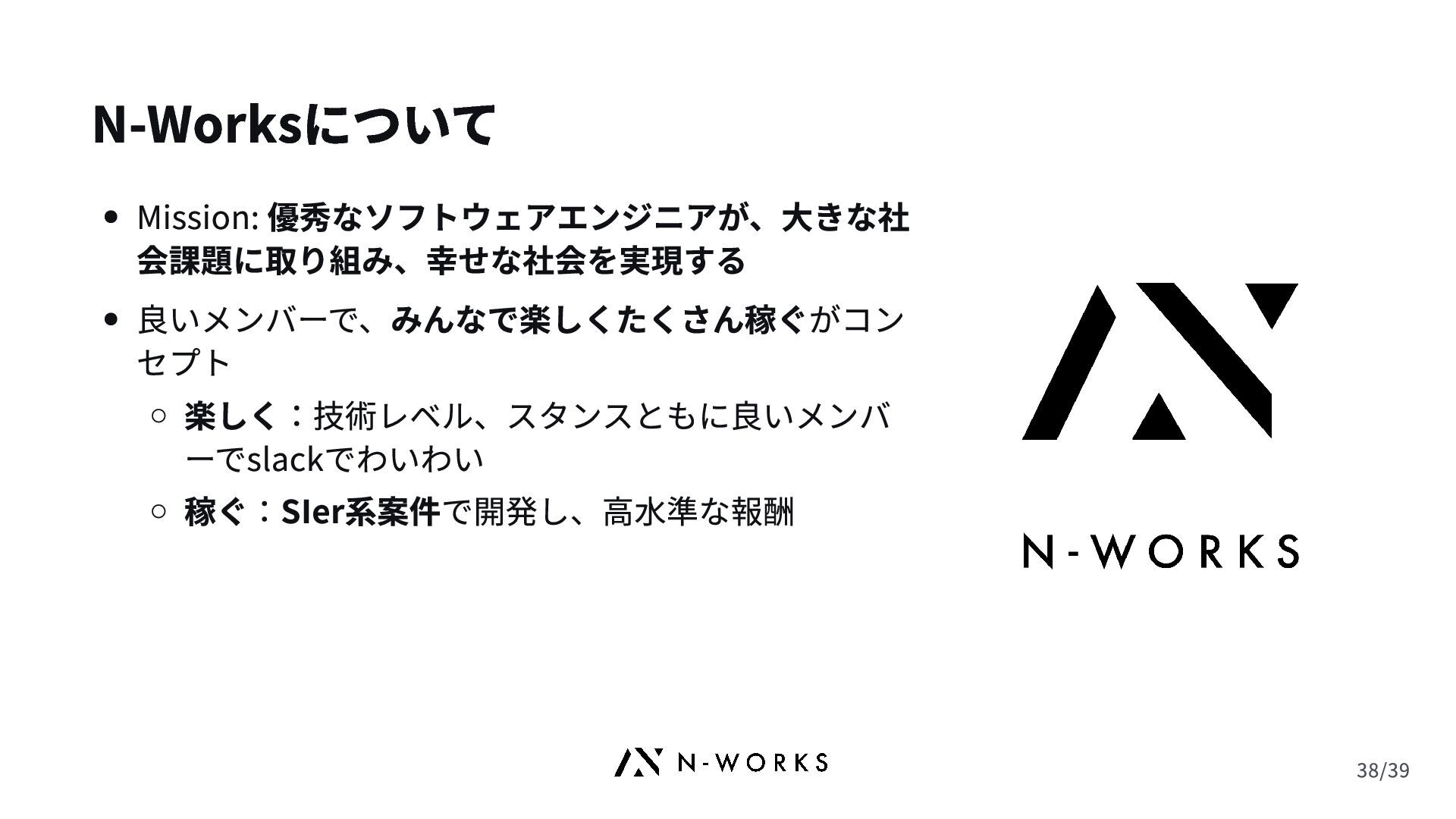 N-Worksについて Mission: 優秀なソフトウェアエンジニアが、大きな社 会課題に取り組み、幸せな社会を実現する 良いメンバーで、みんなで楽しくたくさん稼ぐがコン セプト 楽しく:技術レベル、スタンスともに良いメンバ ーでslackでわいわい 稼ぐ:SIer系案件で開発し、高水準な報酬 38/39