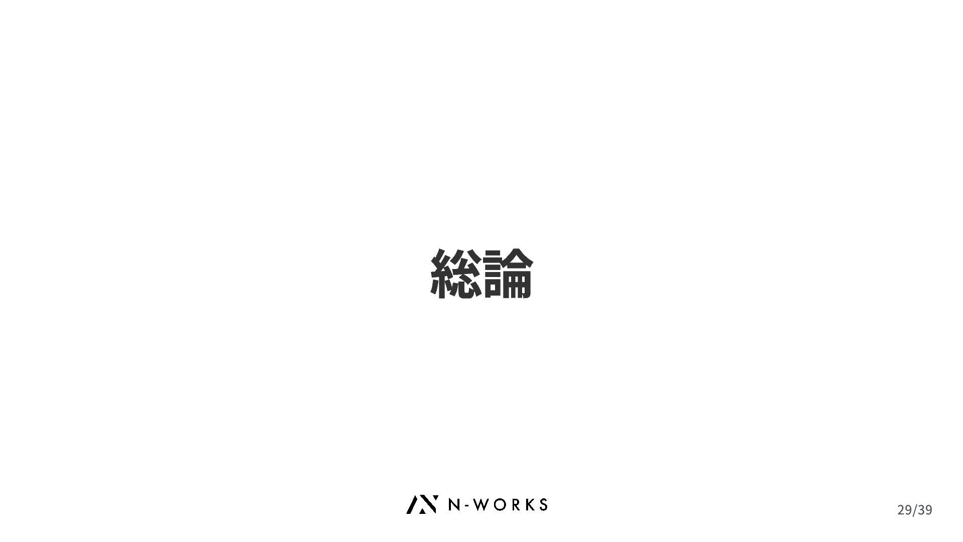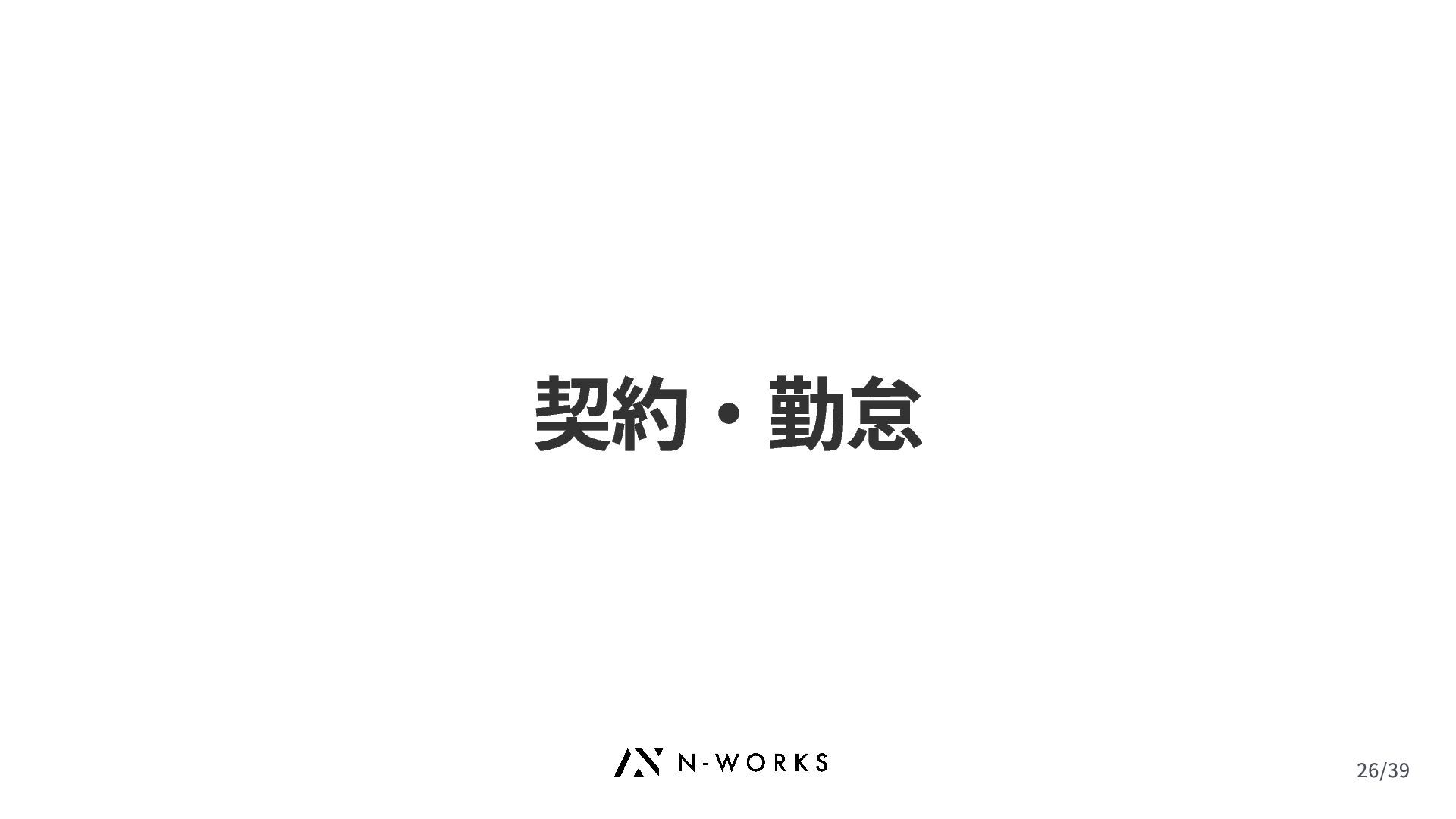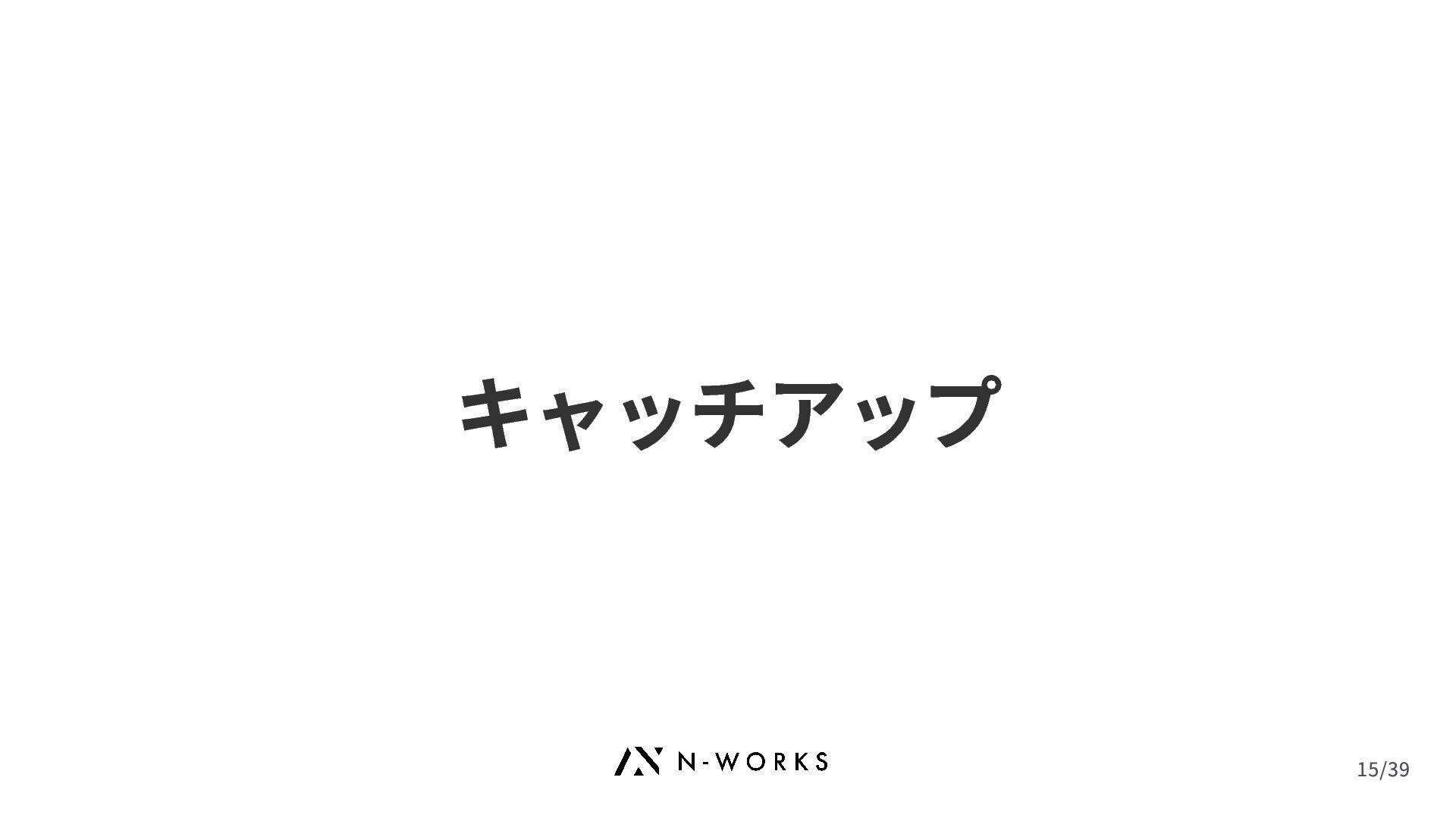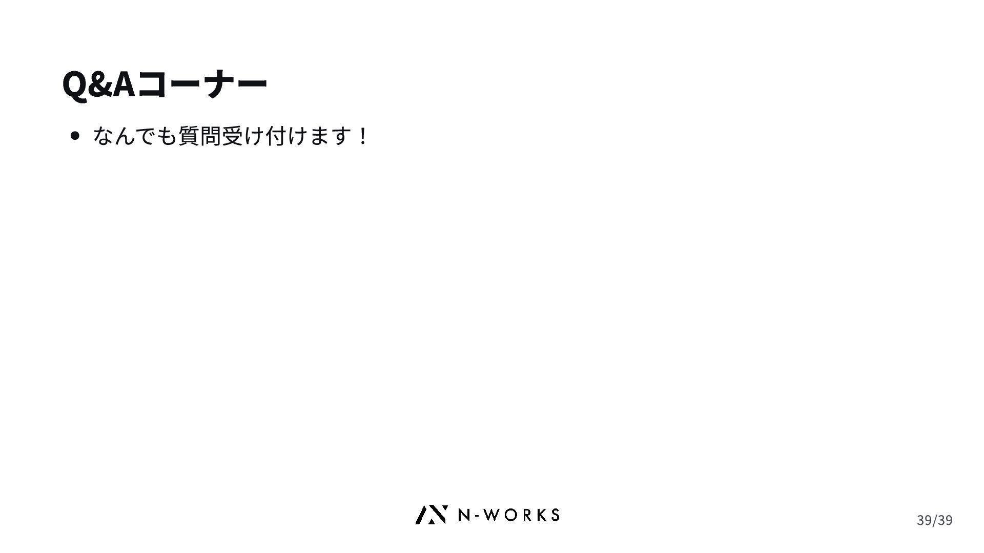N-Worksについて Mission: 優秀なソフトウェアエンジニアが、大きな社 会課題に取り組み、幸せな社会を実現する 良いメンバーで、みんなで楽しくたくさん稼ぐがコン セプト 楽しく:技術レベル、スタンスともに良いメンバ ーでslackでわいわい 稼ぐ:SIer系案件で開発し、高水準な報酬 38/39