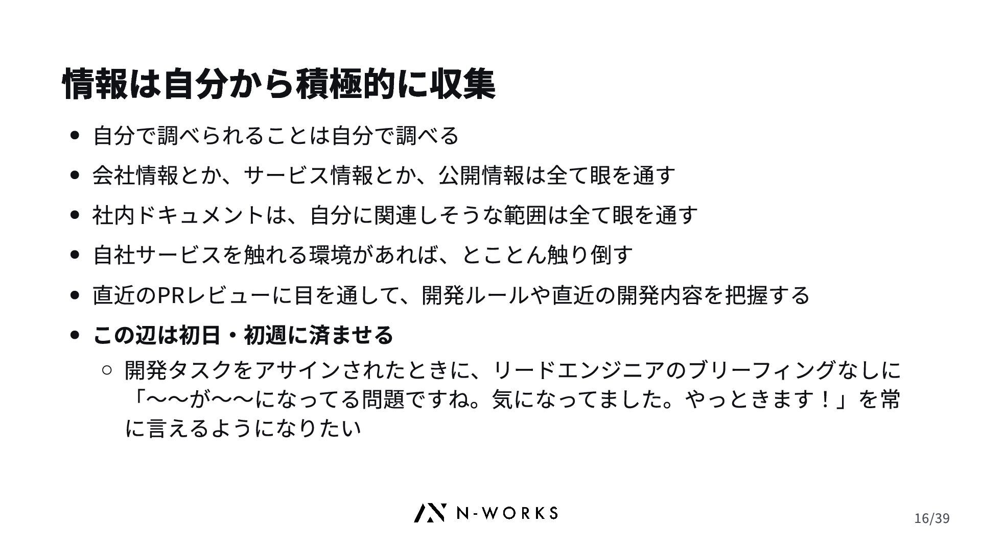 情報は自分から積極的に収集 自分で調べられることは自分で調べる 会社情報とか、サービス情報とか、公開情報は全て眼を通す 社内ドキュメントは、自分に関連しそうな範囲は全て眼を通す 自社サービスを触れる環境があれば、とことん触り倒す 直近のPRレビューに目を通して、開発ルールや直近の開発内容を把握する この辺は初日・初週に済ませる 開発タスクをアサインされたときに、リードエンジニアのブリーフィングなしに 「〜〜が〜〜になってる問題ですね。気になってました。やっときます!」を常 に言えるようになりたい