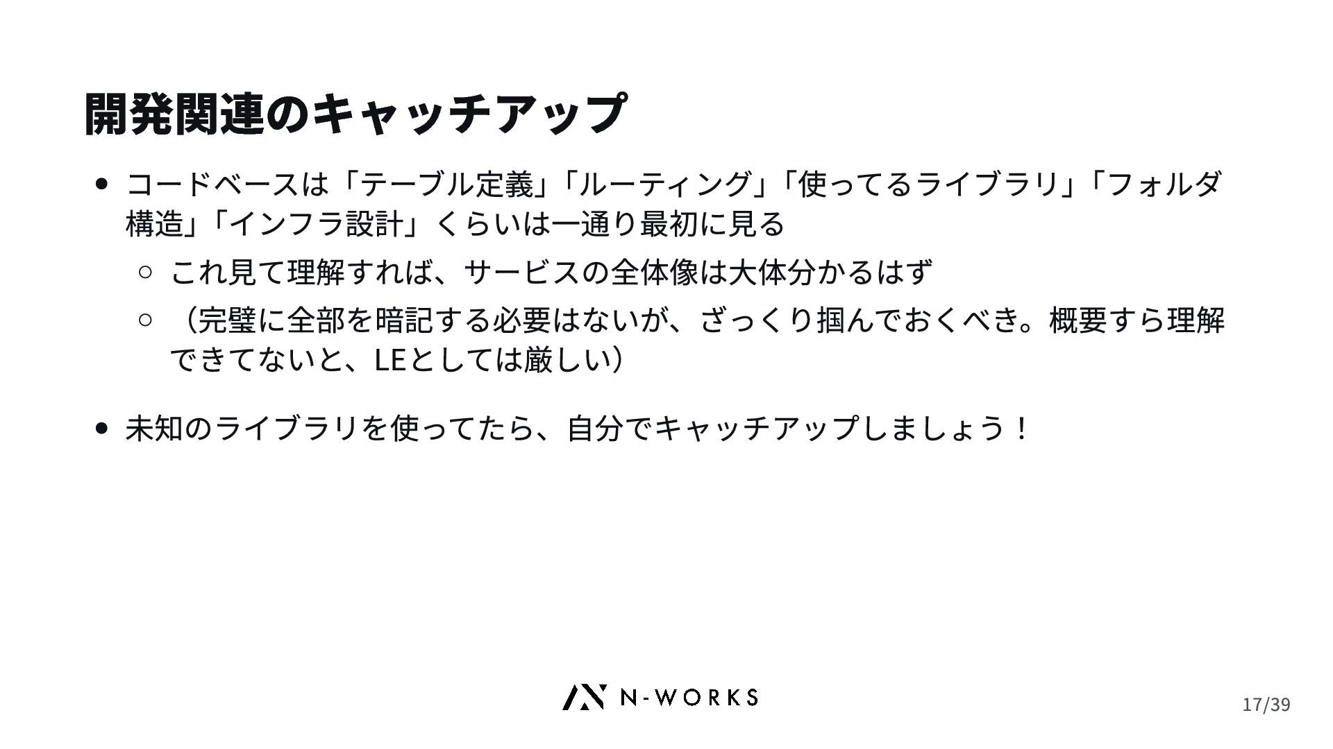 開発関連のキャッチアップ コードベースは「テーブル定義」 「ルーティング」 「使ってるライブラリ」 「フォルダ 構造」 「インフラ設計」くらいは一通り最初に見る これ見て理解すれば、サービスの全体像は大体分かるはず (完璧に全部を暗記する必要はないが、ざっくり掴んでおくべき。概要すら理解 できてないと、LEとしては厳しい)