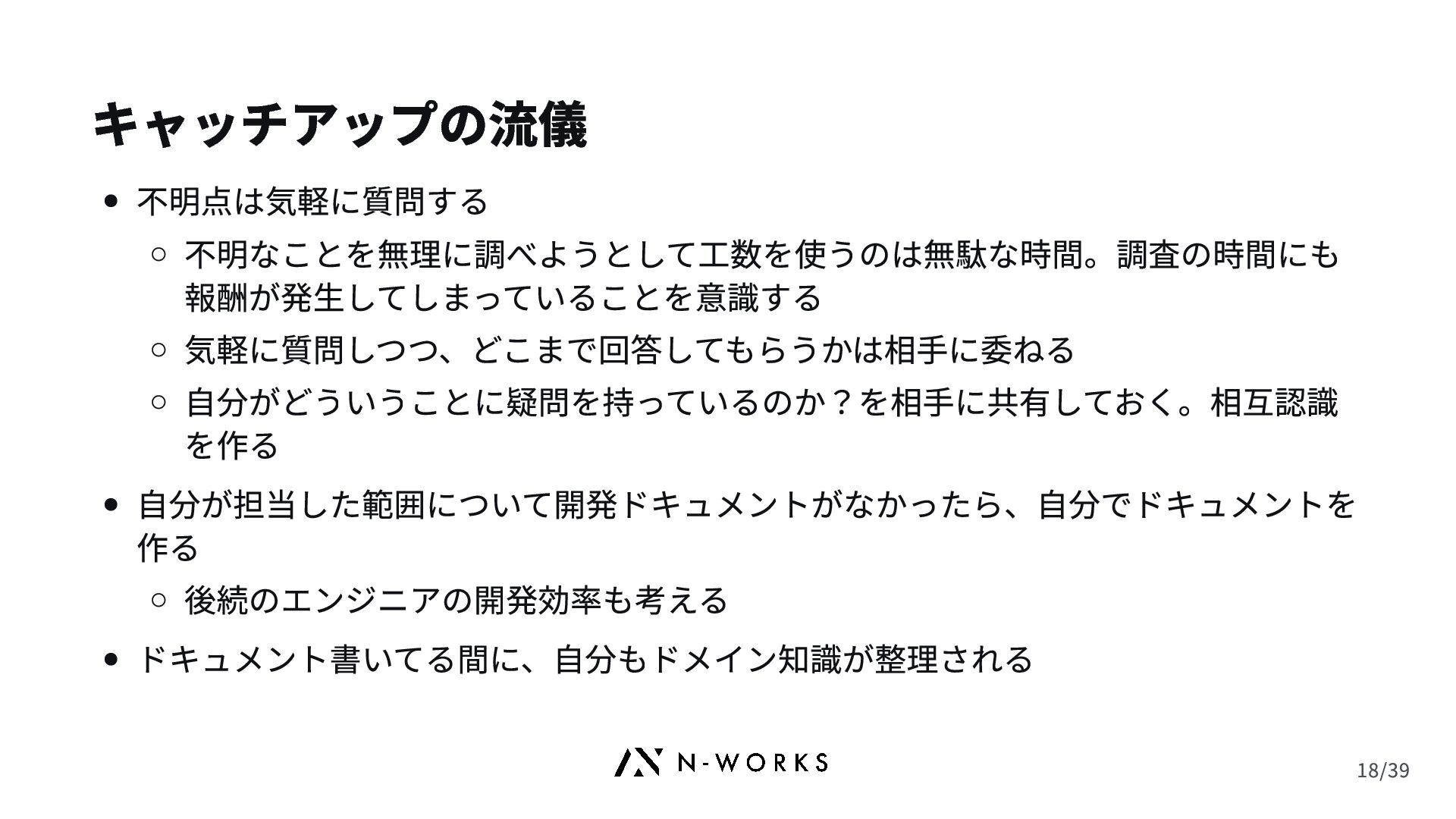キャッチアップの流儀 不明点は気軽に質問する 不明なことを無理に調べようとして工数を使うのは無駄な時間。調査の時間にも 報酬が発生してしまっていることを意識する 気軽に質問しつつ、どこまで回答してもらうかは相手に委ねる 自分がどういうことに疑問を持っているのか?を相手に共有しておく。相互認識 を作る 自分が担当した範囲について開発ドキュメントがなかったら、自分でドキュメントを 作る 後続のエンジニアの開発効率も考える