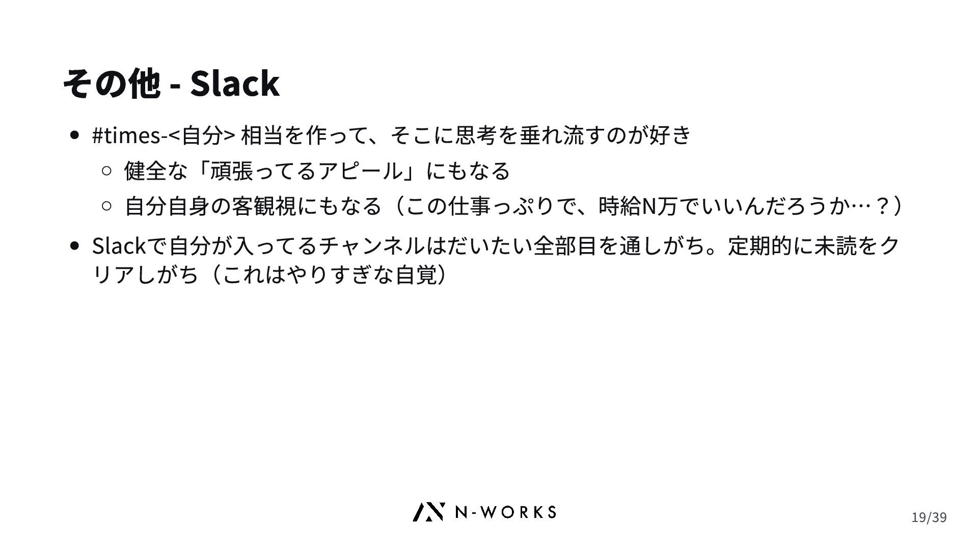 その他 - Slack #times-<自分> 相当を作って、そこに思考を垂れ流すのが好き 健全な「頑張ってるアピール」にもなる 自分自身の客観視にもなる(この仕事っぷりで、時給N万でいいんだろうか…?) Slackで自分が入ってるチャンネルはだいたい全部目を通しがち。定期的に未読をク リアしがち(これはやりすぎな自覚) 19/39