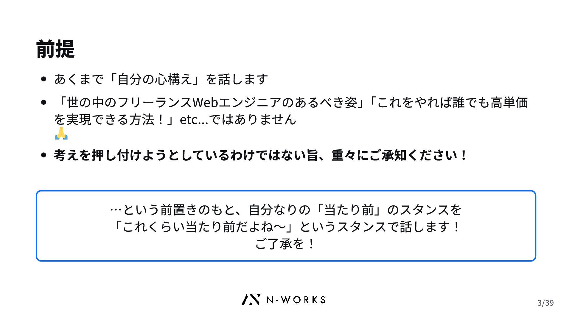 前提 あくまで「自分の心構え」を話します 「世の中のフリーランスWebエンジニアのあるべき姿」 「これをやれば誰でも高単価 を実現できる方法!」etc...ではありません 考えを押し付けようとしているわけではない旨、重々にご承知ください! …という前置きのもと、自分なりの「当たり前」のスタンスを 「これくらい当たり前だよね〜」というスタンスで話します! ご了承を! 3/39