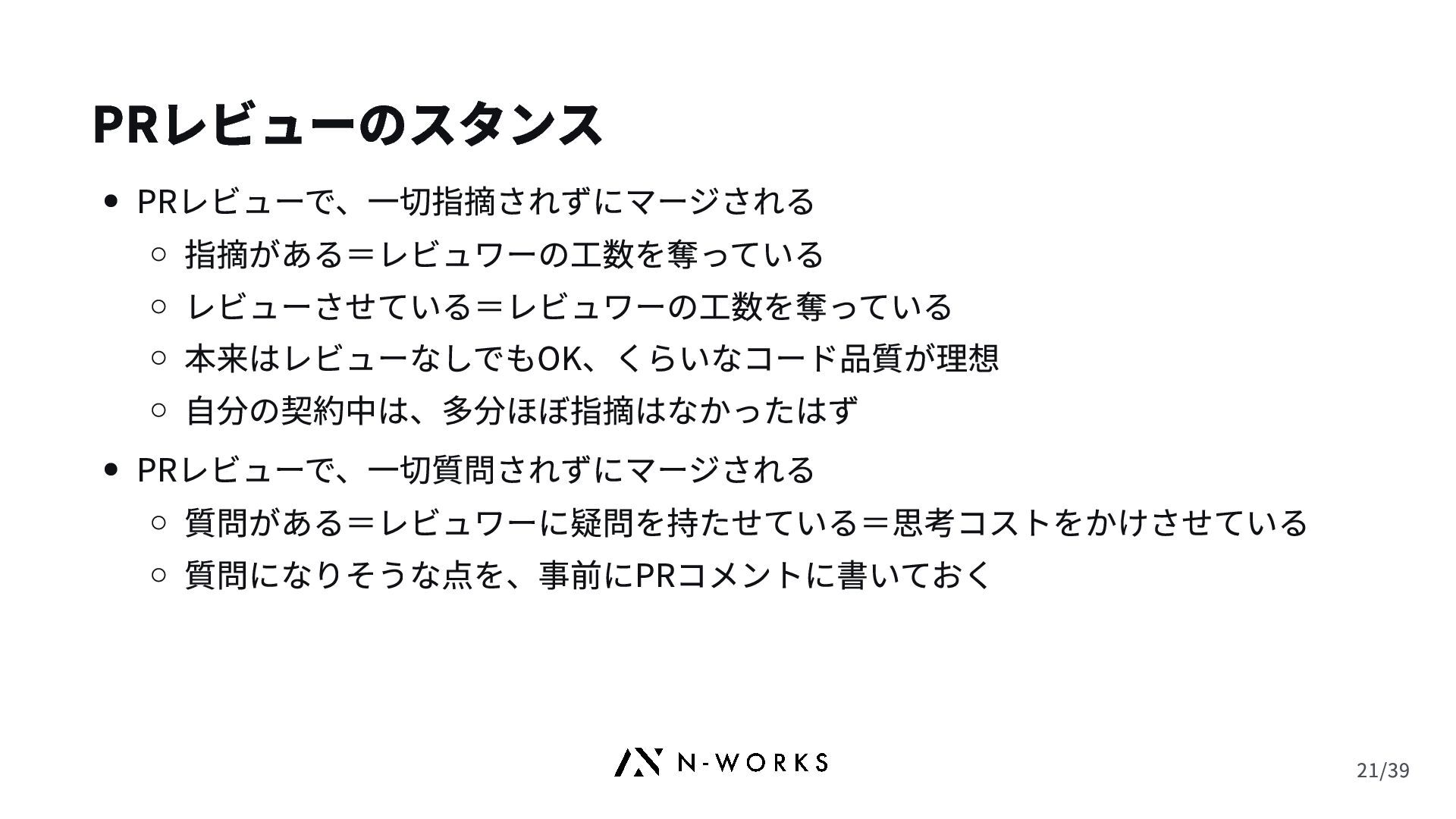 PRレビューのスタンス PRレビューで、一切指摘されずにマージされる 指摘がある=レビュワーの工数を奪っている レビューさせている=レビュワーの工数を奪っている 本来はレビューなしでもOK、くらいなコード品質が理想 自分の契約中は、多分ほぼ指摘はなかったはず PRレビューで、一切質問されずにマージされる 質問がある=レビュワーに疑問を持たせている=思考コストをかけさせている 質問になりそうな点を、事前にPRコメントに書いておく 21/39