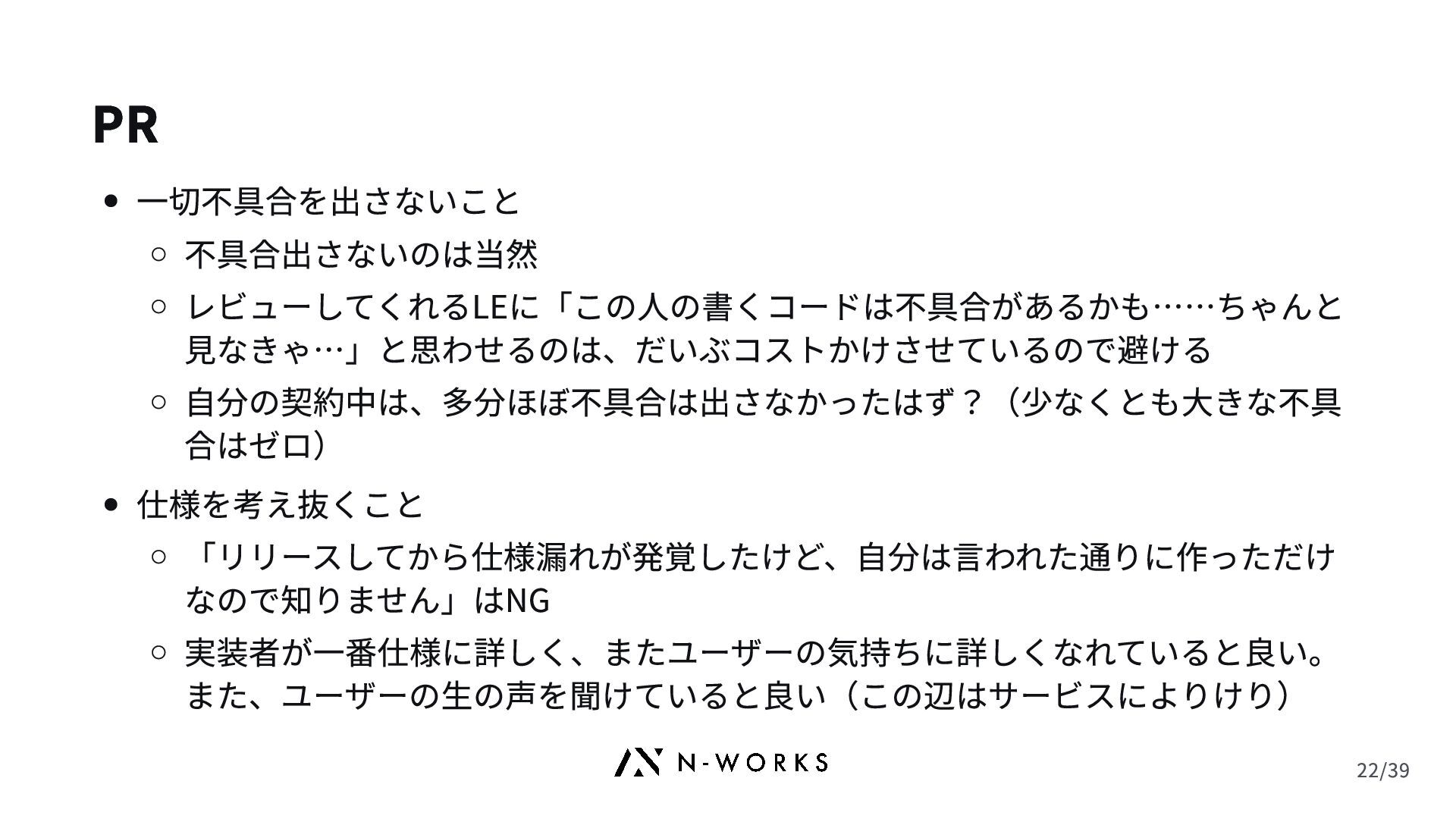 PR 一切不具合を出さないこと 不具合出さないのは当然 レビューしてくれるLEに「この人の書くコードは不具合があるかも……ちゃんと 見なきゃ…」と思わせるのは、だいぶコストかけさせているので避ける 自分の契約中は、多分ほぼ不具合は出さなかったはず?(少なくとも大きな不具 合はゼロ) 仕様を考え抜くこと 「リリースしてから仕様漏れが発覚したけど、自分は言われた通りに作っただけ なので知りません」はNG