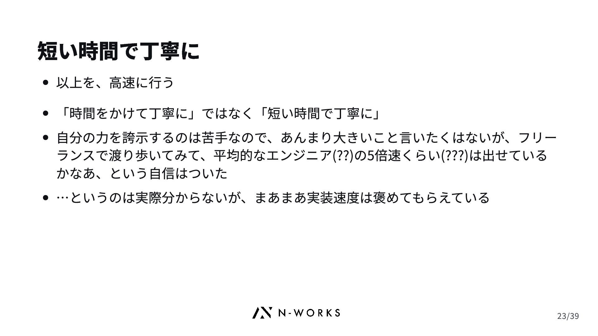 短い時間で丁寧に 以上を、高速に行う 「時間をかけて丁寧に」ではなく「短い時間で丁寧に」 自分の力を誇示するのは苦手なので、あんまり大きいこと言いたくはないが、フリー ランスで渡り歩いてみて、平均的なエンジニア(??)の5倍速くらい(???)は出せている かなあ、という自信はついた …というのは実際分からないが、まあまあ実装速度は褒めてもらえている 23/39
