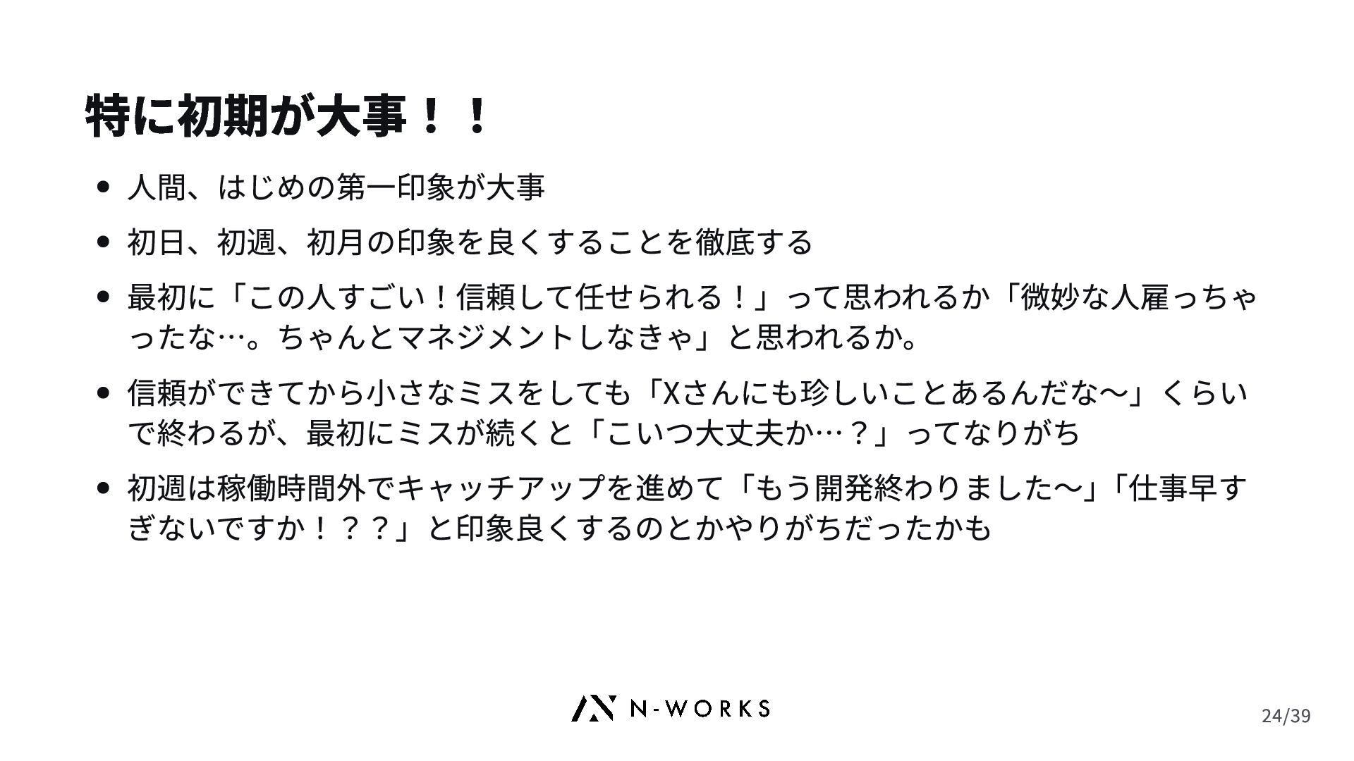 特に初期が大事!! 人間、はじめの第一印象が大事 初日、初週、初月の印象を良くすることを徹底する 最初に「この人すごい!信頼して任せられる!」って思われるか「微妙な人雇っちゃ ったな…。ちゃんとマネジメントしなきゃ」と思われるか。 信頼ができてから小さなミスをしても「Xさんにも珍しいことあるんだな〜」くらい で終わるが、最初にミスが続くと「こいつ大丈夫か…?」ってなりがち 初週は稼働時間外でキャッチアップを進めて「もう開発終わりました〜」 「仕事早す ぎないですか!??」と印象良くするのとかやりがちだったかも