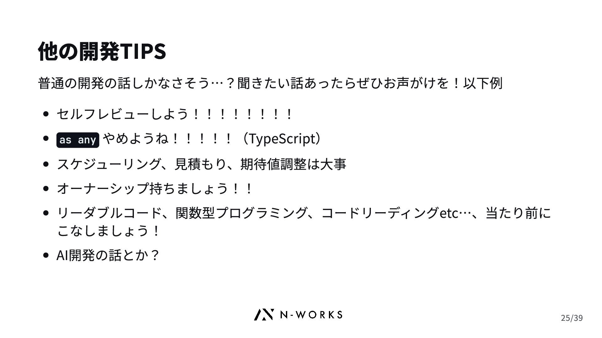 他の開発TIPS 普通の開発の話しかなさそう…?聞きたい話あったらぜひお声がけを!以下例 セルフレビューしよう!!!!!!!! as any やめようね!!!!!(TypeScript) スケジューリング、見積もり、期待値調整は大事 オーナーシップ持ちましょう!! リーダブルコード、関数型プログラミング、コードリーディングetc…、当たり前に こなしましょう!