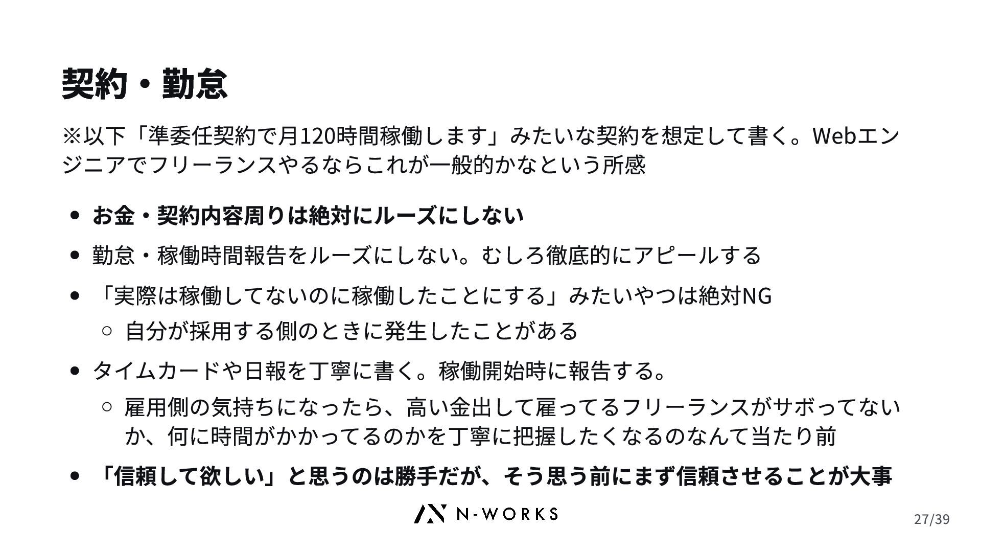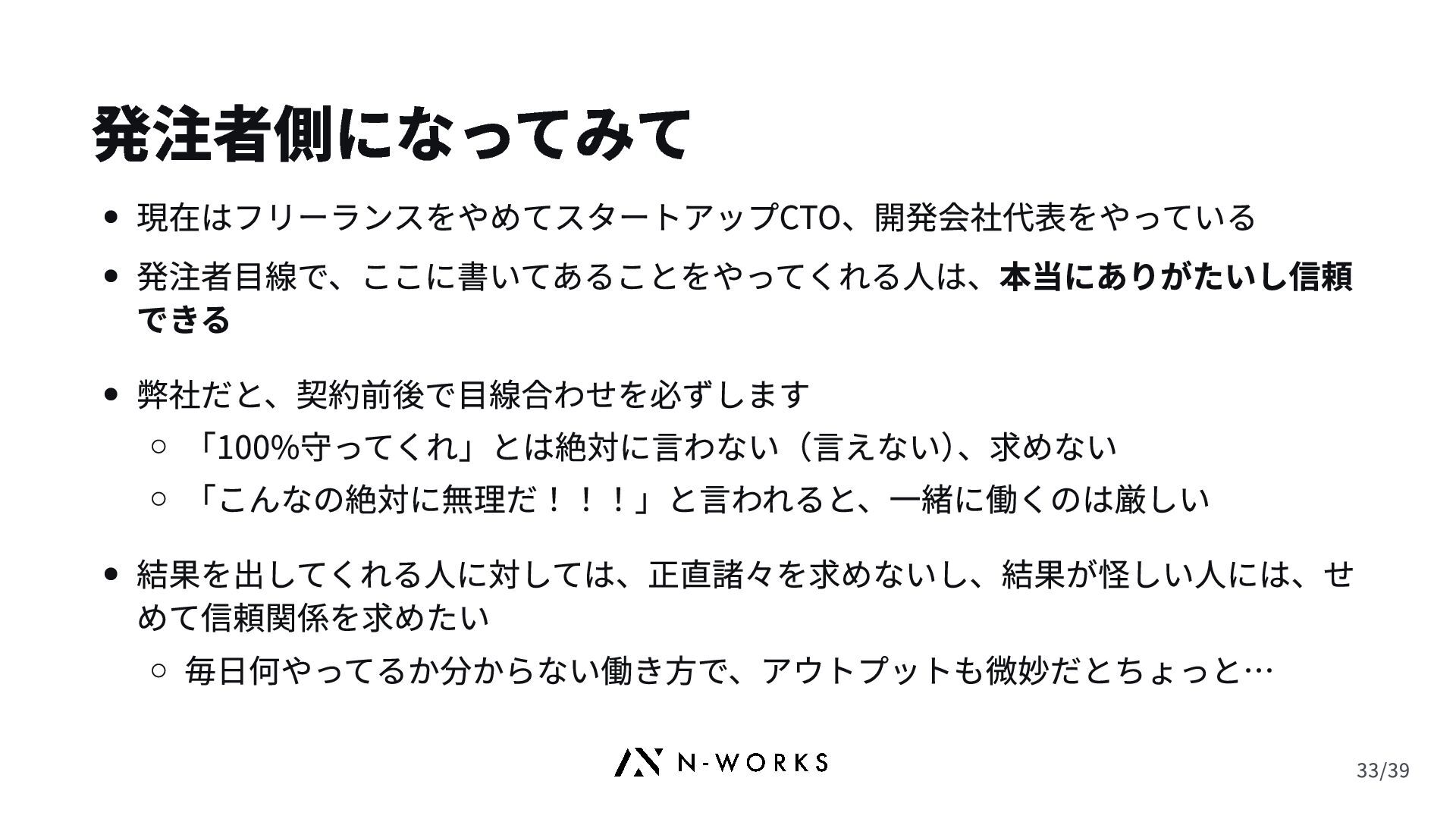 発注者側になってみて 現在はフリーランスをやめてスタートアップCTO、開発会社代表をやっている 発注者目線で、ここに書いてあることをやってくれる人は、本当にありがたいし信頼 できる 弊社だと、契約前後で目線合わせを必ずします 「100%守ってくれ」とは絶対に言わない(言えない) 、求めない 「こんなの絶対に無理だ!!!」と言われると、一緒に働くのは厳しい 結果を出してくれる人に対しては、正直諸々を求めないし、結果が怪しい人には、せ めて信頼関係を求めたい