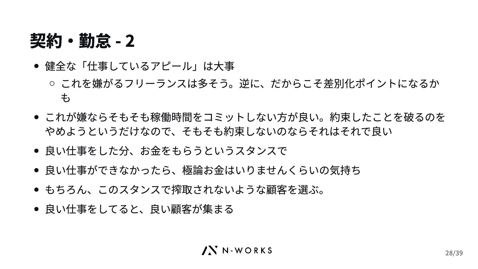 契約・勤怠 - 2 健全な「仕事しているアピール」は大事 これを嫌がるフリーランスは多そう。逆に、だからこそ差別化ポイントになるか も これが嫌ならそもそも稼働時間をコミットしない方が良い。約束したことを破るのを やめようというだけなので、そもそも約束しないのならそれはそれで良い 良い仕事をした分、お金をもらうというスタンスで 良い仕事ができなかったら、極論お金はいりませんくらいの気持ち