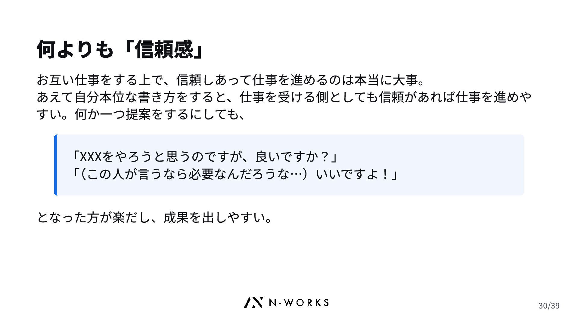 何よりも「信頼感」 お互い仕事をする上で、信頼しあって仕事を進めるのは本当に大事。 あえて自分本位な書き方をすると、仕事を受ける側としても信頼があれば仕事を進めや すい。何か一つ提案をするにしても、 となった方が楽だし、成果を出しやすい。 「XXXをやろうと思うのですが、良いですか?」 「 (この人が言うなら必要なんだろうな…)いいですよ!」 30/39