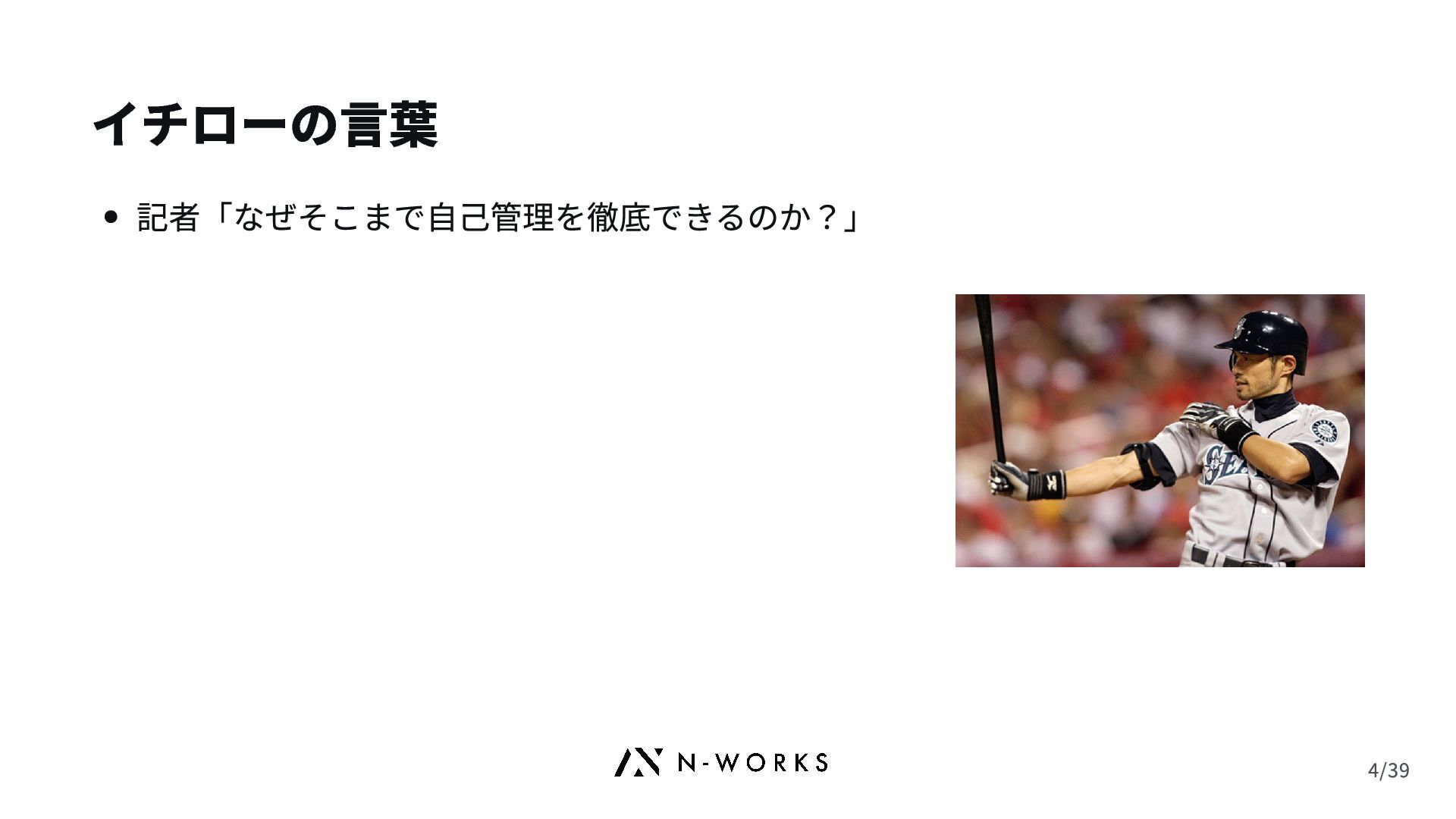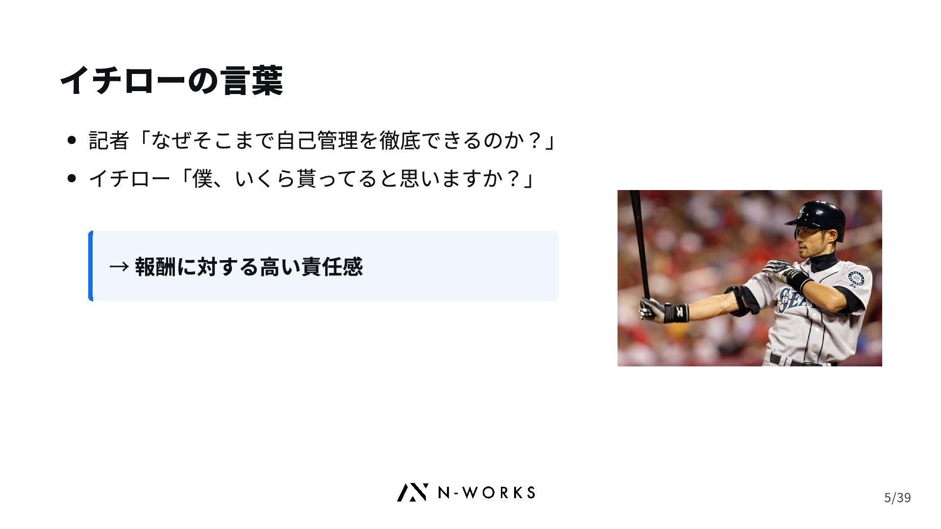 イチローの言葉 記者「なぜそこまで自己管理を徹底できるのか?」 イチロー「僕、いくら貰ってると思いますか?」 → 報酬に対する高い責任感 5/39