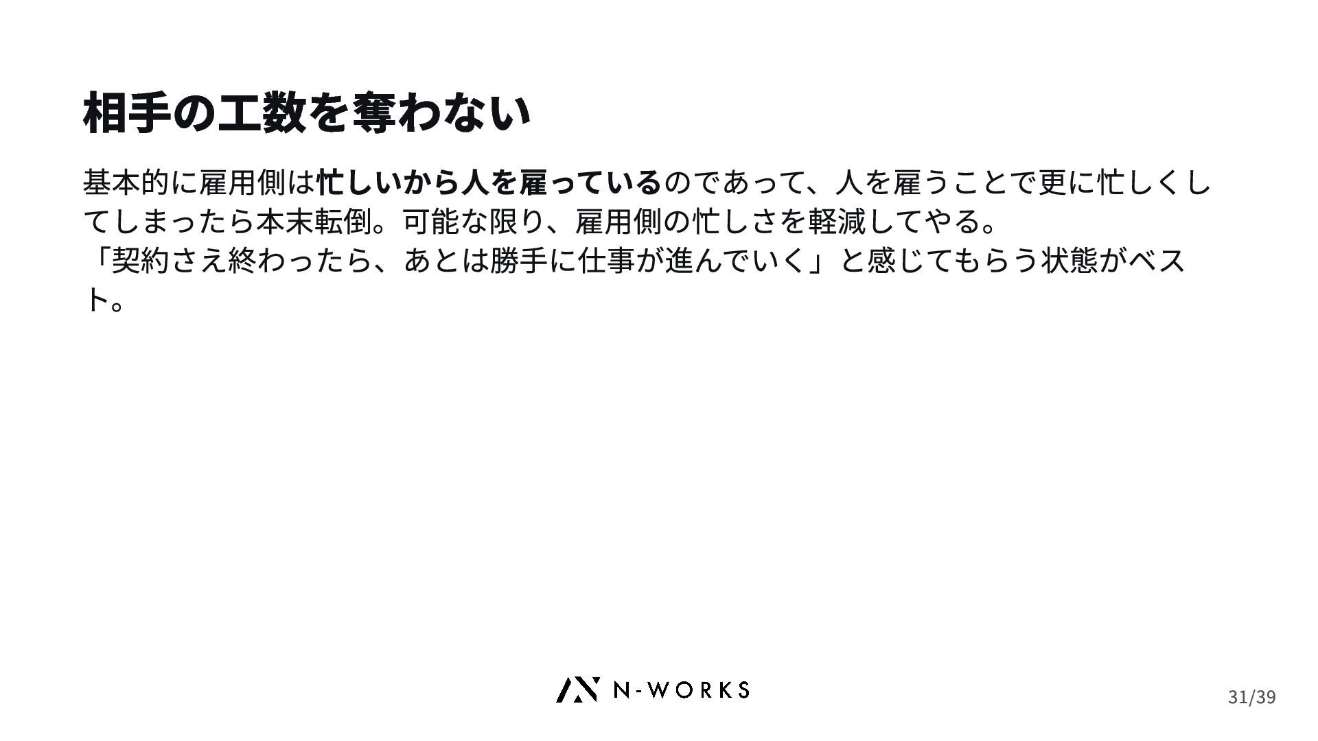 相手の工数を奪わない 基本的に雇用側は忙しいから人を雇っているのであって、人を雇うことで更に忙しくし てしまったら本末転倒。可能な限り、雇用側の忙しさを軽減してやる。 「契約さえ終わったら、あとは勝手に仕事が進んでいく」と感じてもらう状態がベス ト。 31/39