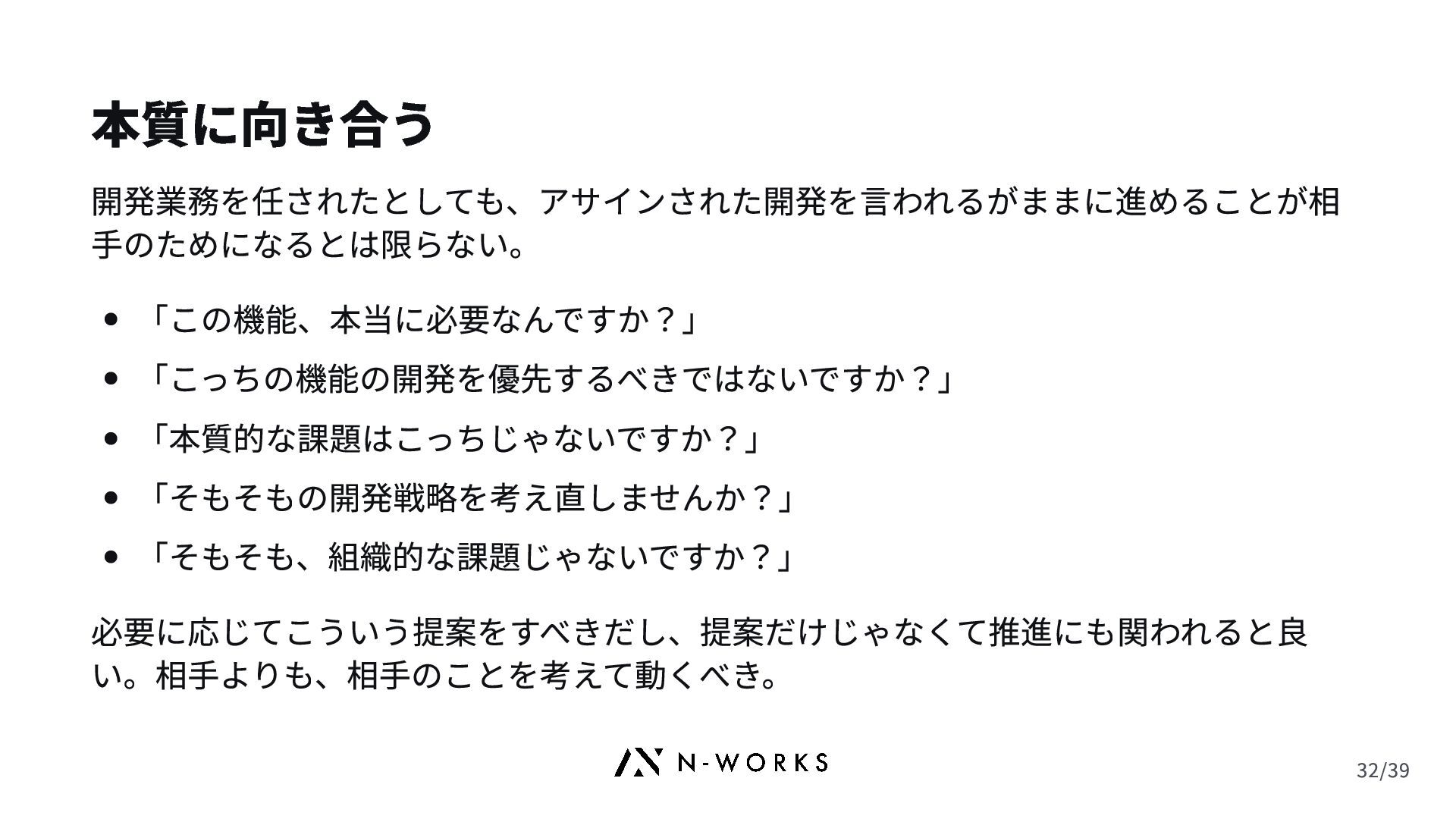 本質に向き合う 開発業務を任されたとしても、アサインされた開発を言われるがままに進めることが相 手のためになるとは限らない。 「この機能、本当に必要なんですか?」 「こっちの機能の開発を優先するべきではないですか?」 「本質的な課題はこっちじゃないですか?」 「そもそもの開発戦略を考え直しませんか?」 「そもそも、組織的な課題じゃないですか?」 必要に応じてこういう提案をすべきだし、提案だけじゃなくて推進にも関われると良 い。相手よりも、相手のことを考えて動くべき。