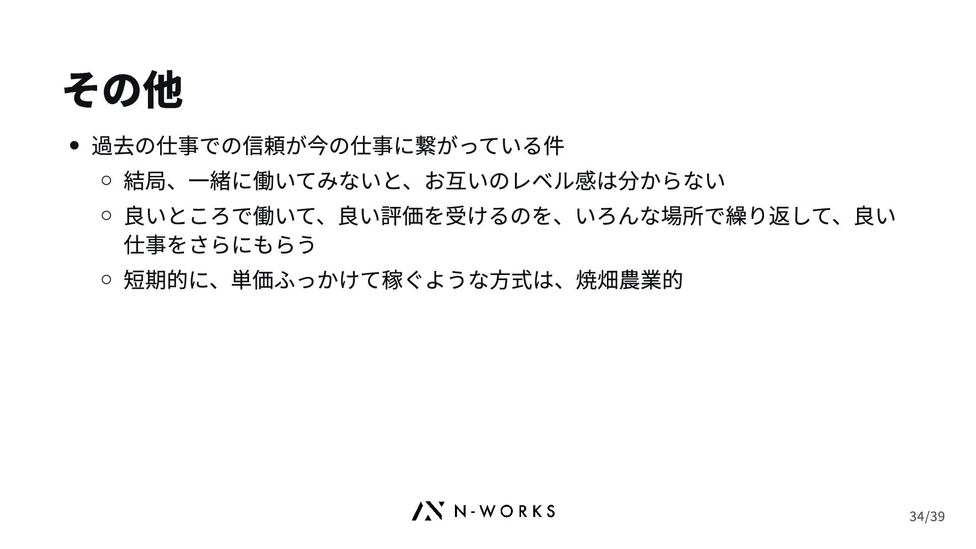 その他 過去の仕事での信頼が今の仕事に繋がっている件 結局、一緒に働いてみないと、お互いのレベル感は分からない 良いところで働いて、良い評価を受けるのを、いろんな場所で繰り返して、良い 仕事をさらにもらう 短期的に、単価ふっかけて稼ぐような方式は、焼畑農業的 34/39