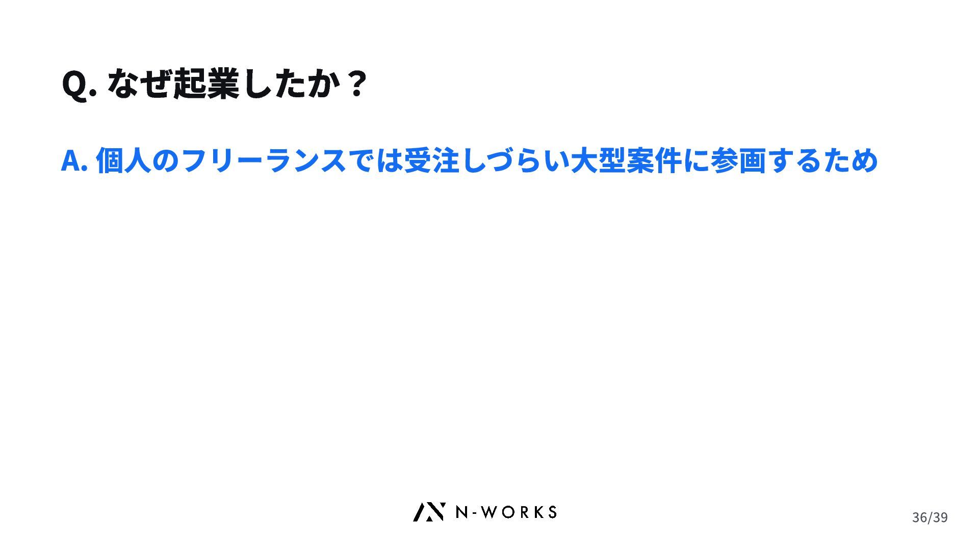 Q. なぜ起業したか? A. 個人のフリーランスでは受注しづらい大型案件に参画するため 36/39