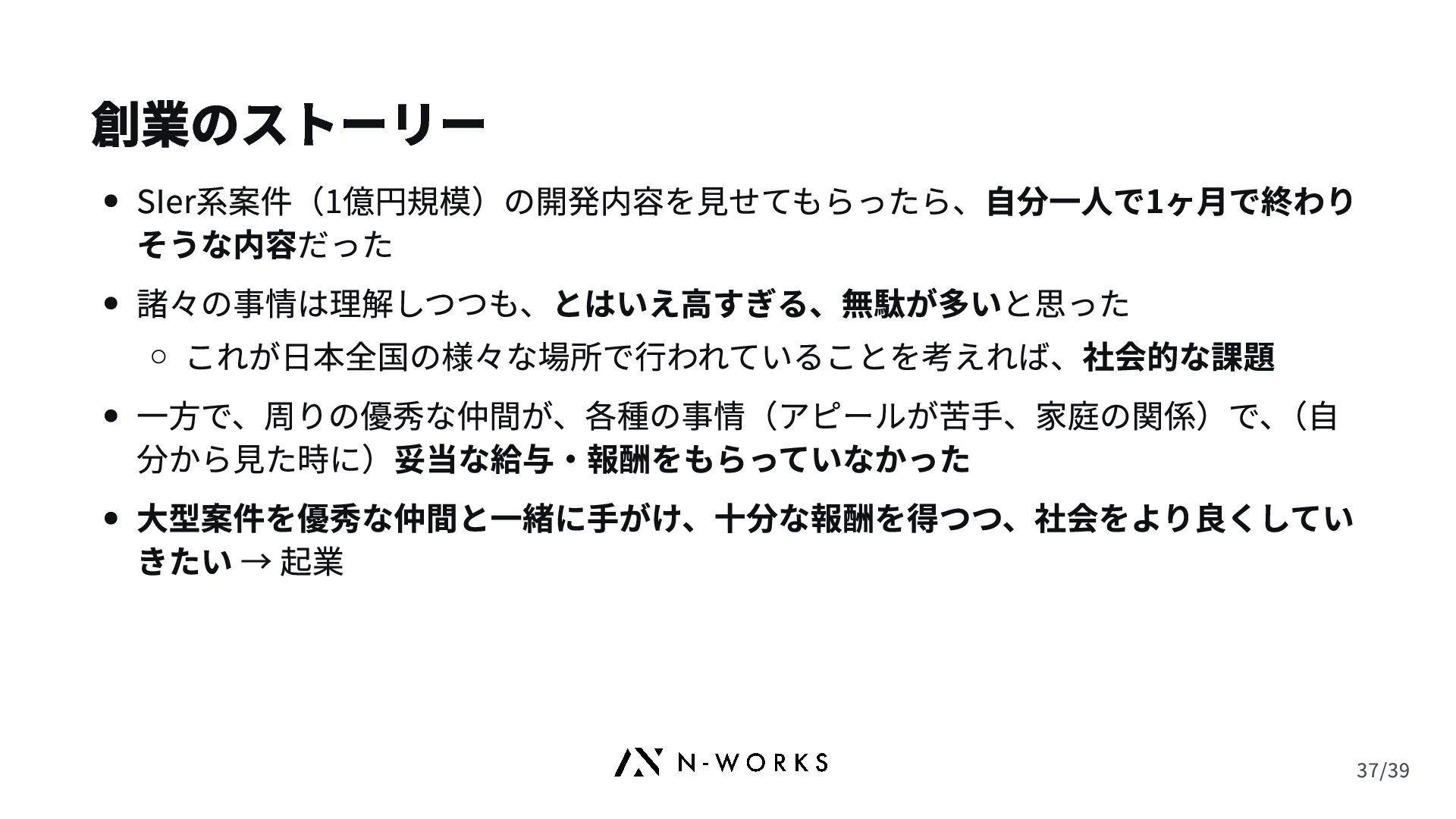 創業のストーリー SIer系案件(1億円規模)の開発内容を見せてもらったら、自分一人で1ヶ月で終わり そうな内容だった 諸々の事情は理解しつつも、とはいえ高すぎる、無駄が多いと思った これが日本全国の様々な場所で行われていることを考えれば、社会的な課題 一方で、周りの優秀な仲間が、各種の事情(アピールが苦手、家庭の関係)で、 (自 分から見た時に)妥当な給与・報酬をもらっていなかった 大型案件を優秀な仲間と一緒に手がけ、十分な報酬を得つつ、社会をより良くしてい きたい