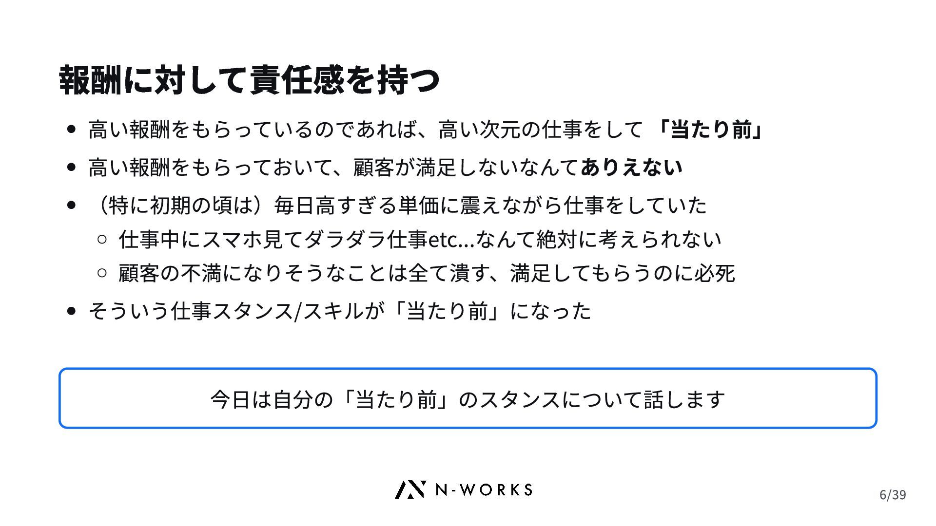 報酬に対して責任感を持つ 高い報酬をもらっているのであれば、高い次元の仕事をして 「当たり前」 高い報酬をもらっておいて、顧客が満足しないなんてありえない (特に初期の頃は)毎日高すぎる単価に震えながら仕事をしていた 仕事中にスマホ見てダラダラ仕事etc...なんて絶対に考えられない 顧客の不満になりそうなことは全て潰す、満足してもらうのに必死 そういう仕事スタンス/スキルが「当たり前」になった 今日は自分の「当たり前」のスタンスについて話します 6/39