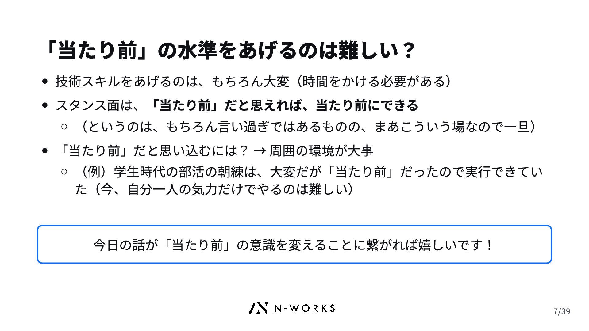 「当たり前」の水準をあげるのは難しい? 技術スキルをあげるのは、もちろん大変(時間をかける必要がある) スタンス面は、「当たり前」だと思えれば、当たり前にできる (というのは、もちろん言い過ぎではあるものの、まあこういう場なので一旦) 「当たり前」だと思い込むには? → 周囲の環境が大事 (例)学生時代の部活の朝練は、大変だが「当たり前」だったので実行できてい た(今、自分一人の気力だけでやるのは難しい) 今日の話が「当たり前」の意識を変えることに繋がれば嬉しいです!