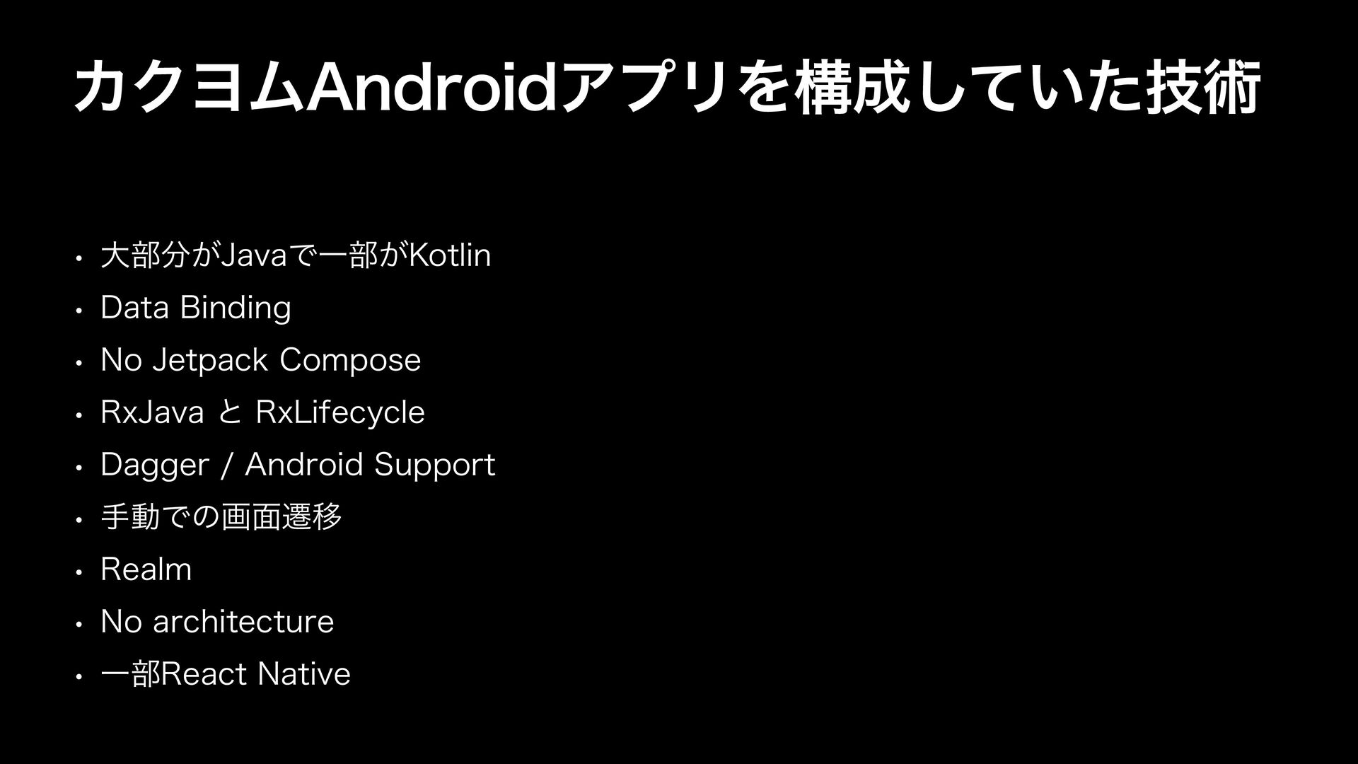 ΧΫϤϜ"OESPJEΞϓϦΛߏ͍ٕͯͨ͠ज़ w େ෦͕+BWBͰҰ෦͕,PUMJO w %BUB#JOEJOH w /P+FUQBDL$PNQPTF w 3Y+BWBͱ3Y-JGFDZDMF w