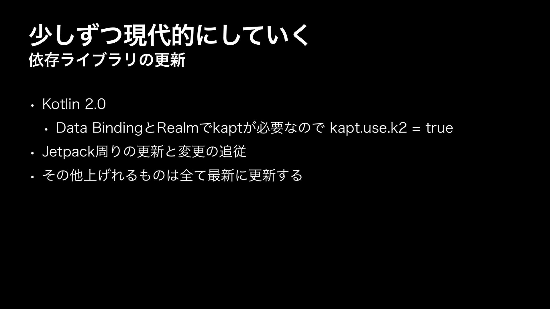 গͣͭ͠ݱతʹ͍ͯ͘͠ ґଘϥΠϒϥϦͷߋ৽ w ,PUMJO w %BUB#JOEJOHͱ3FBMNͰLBQU͕ඞཁͳͷͰLBQUVTFLUSVF w +FUQBDLपΓͷߋ৽ͱมߋͷै w ͦͷଞ্͛ΕΔͷશͯ࠷৽ʹߋ৽͢Δ