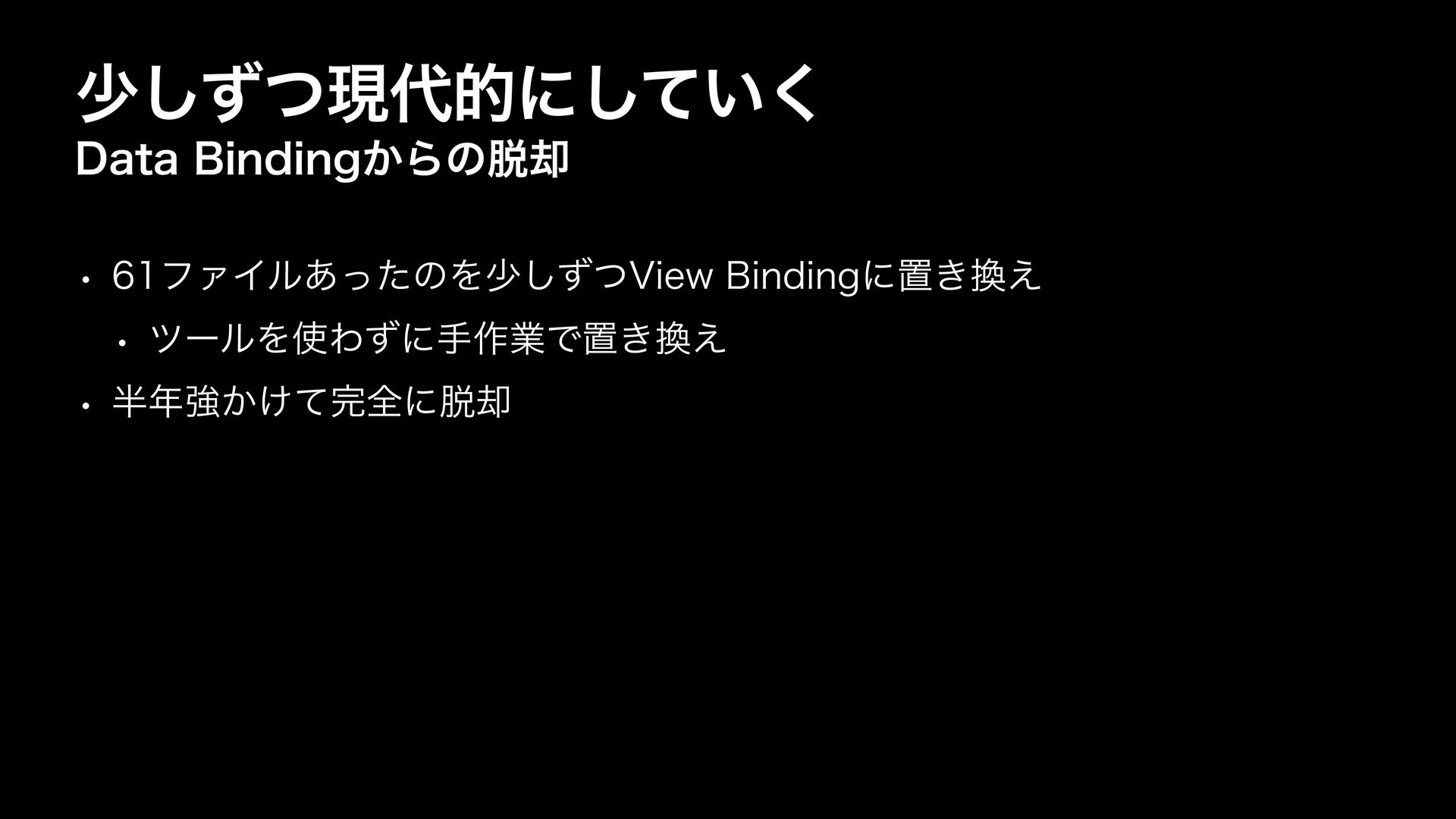 গͣͭ͠ݱతʹ͍ͯ͘͠ %BUB#JOEJOH͔Βͷ٫ w ϑΝΠϧ͋ͬͨͷΛগͣͭ͠7JFX#JOEJOHʹஔ͖͑ w πʔϧΛΘͣʹख࡞ۀͰஔ͖͑ w ڧ͔͚ͯશʹ٫