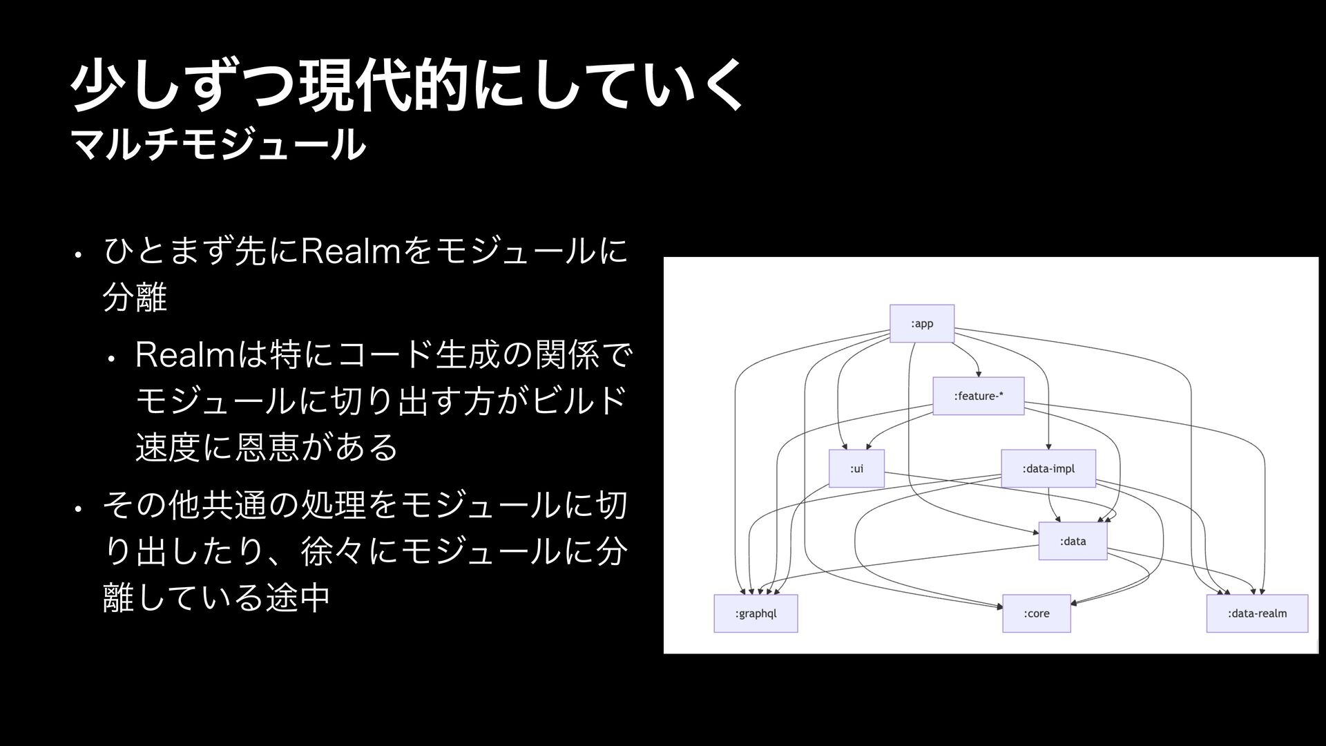 গͣͭ͠ݱతʹ͍ͯ͘͠ ϚϧνϞδϡʔϧ w ͻͱ·ͣઌʹ3FBMNΛϞδϡʔϧʹ w 3FBMNಛʹίʔυੜͷؔͰ ϞδϡʔϧʹΓग़͢ํ͕Ϗϧυ ʹԸܙ͕͋Δ w