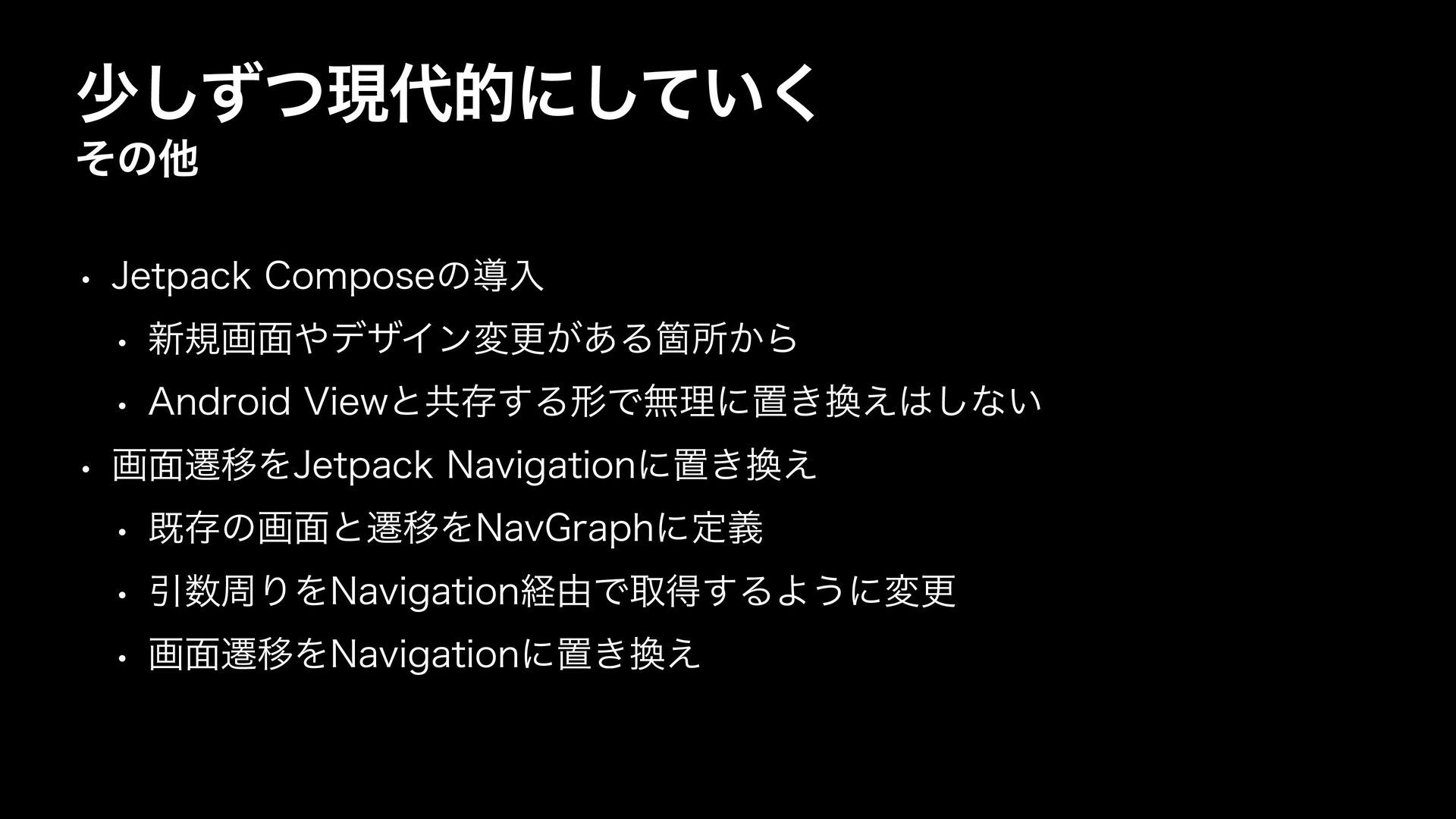 গͣͭ͠ݱతʹ͍ͯ͘͠ ͦͷଞ w +FUQBDL$PNQPTFͷಋೖ w ৽نը໘σβΠϯมߋ͕͋ΔՕॴ͔Β w "OESPJE7JFXͱڞଘ͢ΔܗͰແཧʹஔ͖͑͠ͳ͍ w ը໘ભҠΛ+FUQBDL/BWJHBUJPOʹஔ͖͑