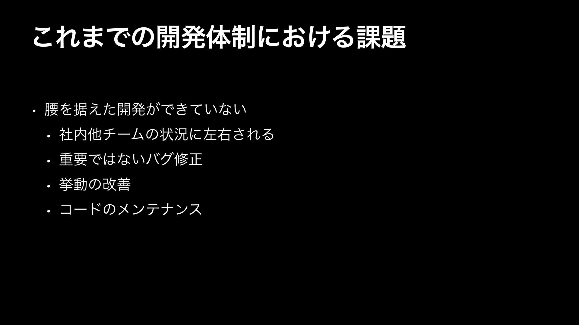 ͜Ε·Ͱͷ։ൃମ੍ʹ͓͚Δ՝ w ࠊΛਾ͑ͨ։ൃ͕Ͱ͖͍ͯͳ͍ w ࣾଞνʔϜͷঢ়گʹࠨӈ͞ΕΔ w ॏཁͰͳ͍όάमਖ਼ w ڍಈͷվળ w