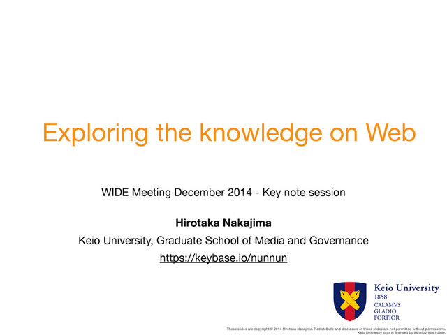 disclosure of these slides are not permitted without permissions. Keio University logo is licensed by its copyright holder. Exploring the knowledge on Web WIDE Meeting December 2014 - Key note session Hirotaka Nakajima Keio University, Graduate School of Media and Governance https://keybase.io/nunnun 1