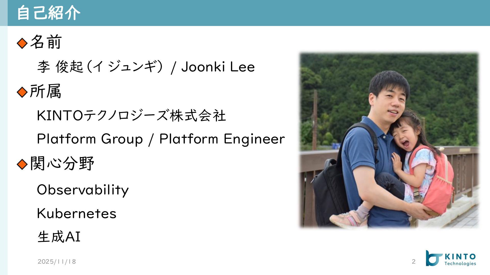 所属 KINTOテクノロジーズ株式会社 Platform Group / Platform Engineer 関心分野 Observability Kubernetes 生成AI