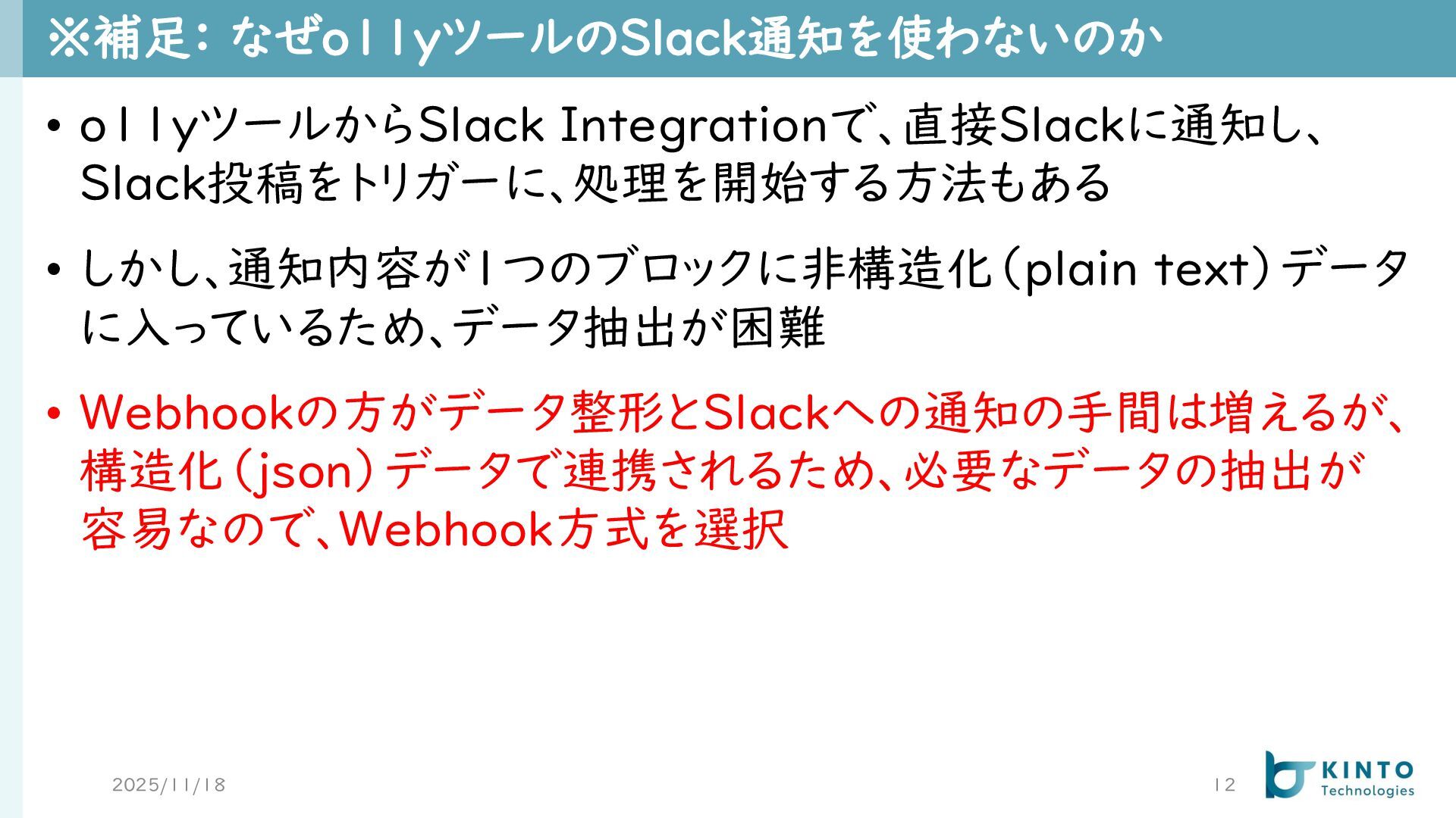 ※補足: なぜo11yツールのSlack通知を使わないのか 2025/11/18 12 • o11yツールからSlack Integrationで、直接Slackに通知し、 Slack投稿をトリガーに、処理を開始する方法もある • しかし、通知内容が1つのブロックに非構造化(plain