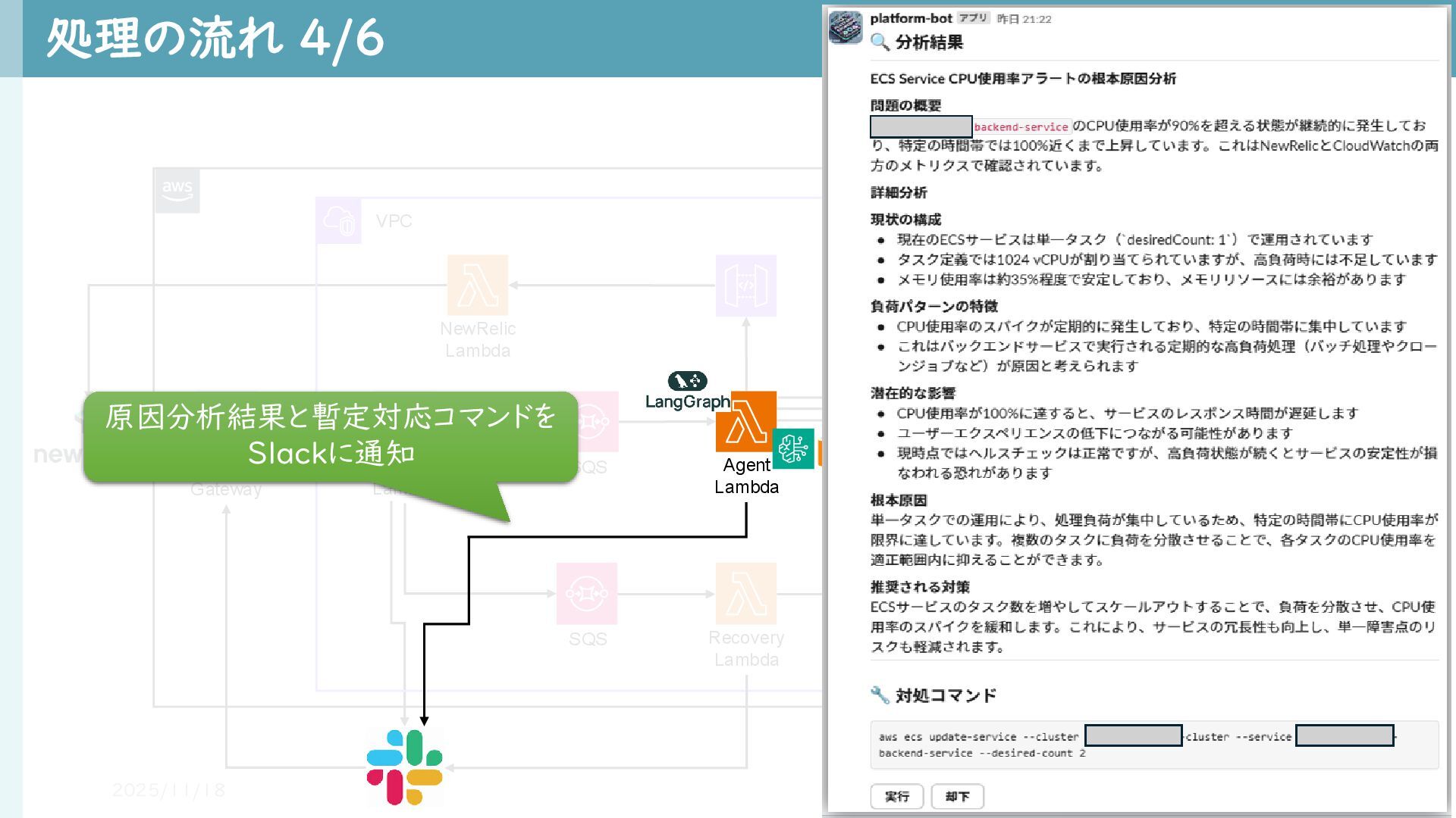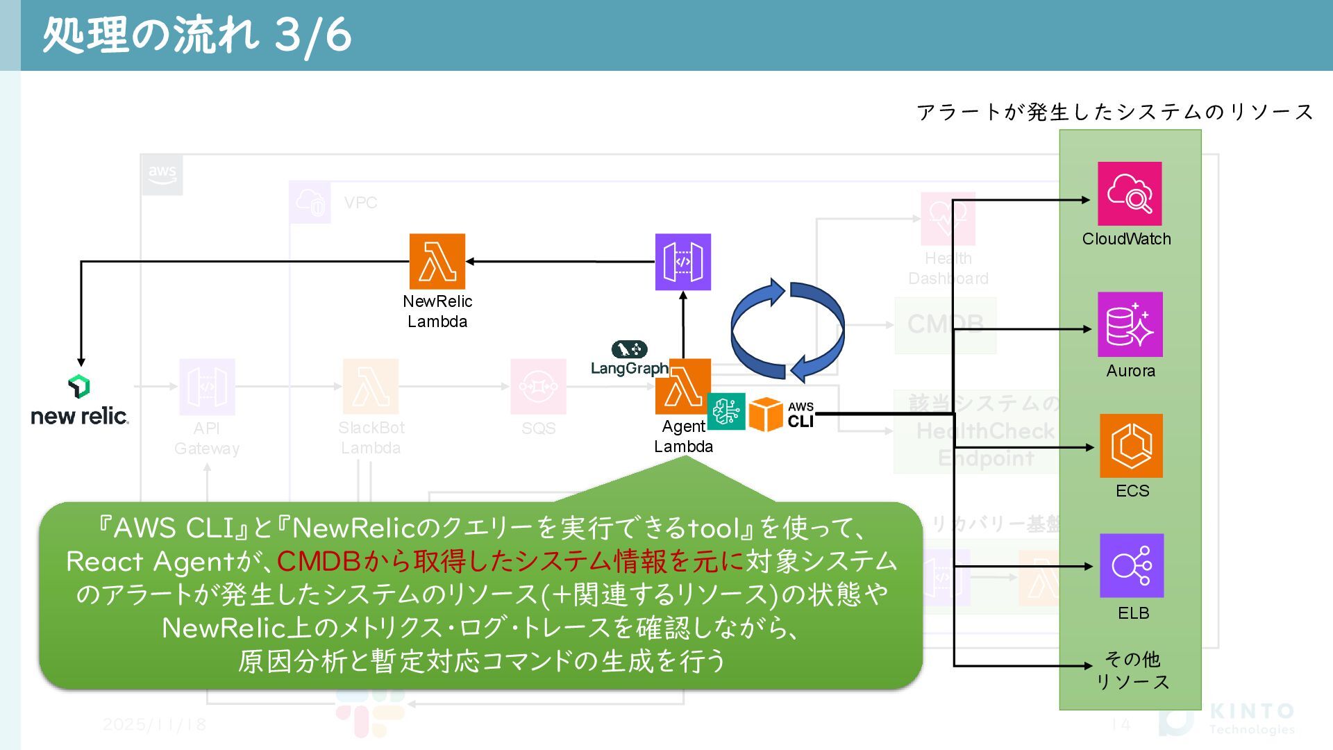 Lambda 処理の流れ 3/6 2025/11/18 14 VPC リカバリー基盤 SQS Recovery Lambda Agent Lambda NewRelic Lambda CloudWatch Aurora ECS ELB その他 リソース アラートが発生したシステムのリソース 『AWS CLI』と『NewRelicのクエリーを実行できるtool』を使って、 React Agentが、CMDBから取得したシステム情報を元に対象システム のアラートが発生したシステムのリソース(+関連するリソース)の状態や NewRelic上のメトリクス・ログ・トレースを確認しながら、 原因分析と暫定対応コマンドの生成を行う