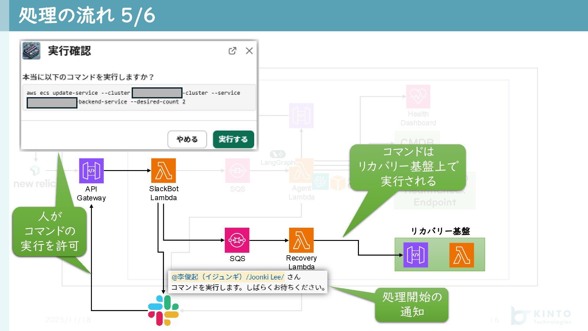 SQS 処理の流れ 5/6 2025/11/18 16 VPC API Gateway SlackBot Lambda リカバリー基盤 SQS Recovery Lambda 人が コマンドの 実行を許可 処理開始の 通知 コマンドは リカバリー基盤上で 実行される