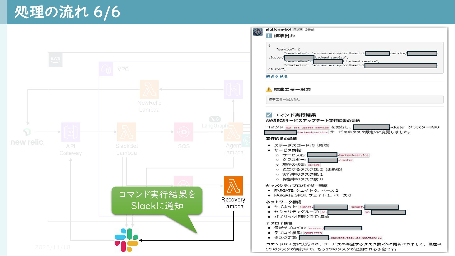 CMDB Health Dashboard 該当システムの HealthCheck Endpoint SQS 処理の流れ 6/6 2025/11/18 17 VPC Recovery Lambda コマンド実行結果を Slackに通知