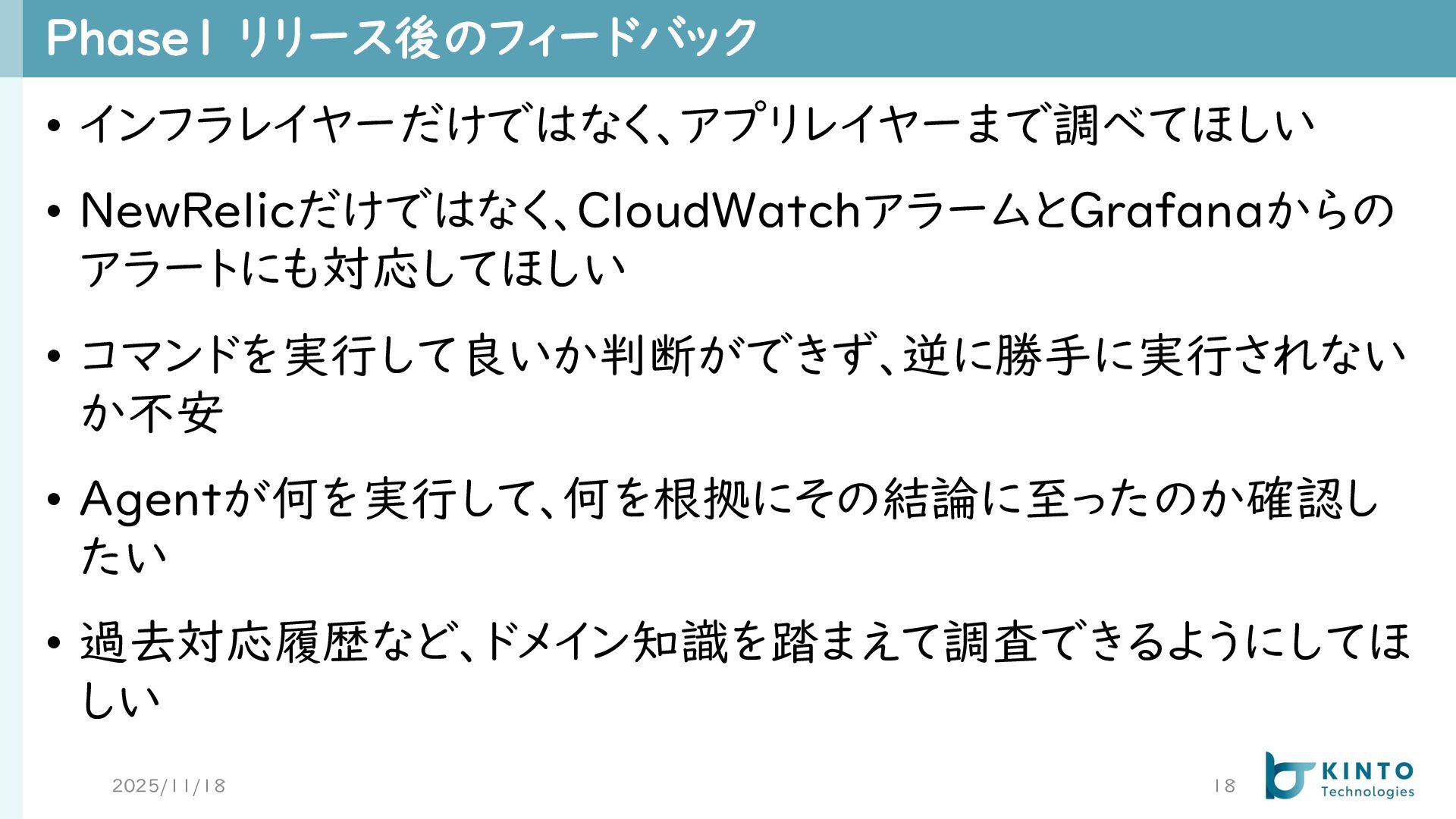 Phase1 リリース後のフィードバック • インフラレイヤーだけではなく、アプリレイヤーまで調べてほしい • NewRelicだけではなく、CloudWatchアラームとGrafanaからの アラートにも対応してほしい • コマンドを実行して良いか判断ができず、逆に勝手に実行されない か不安