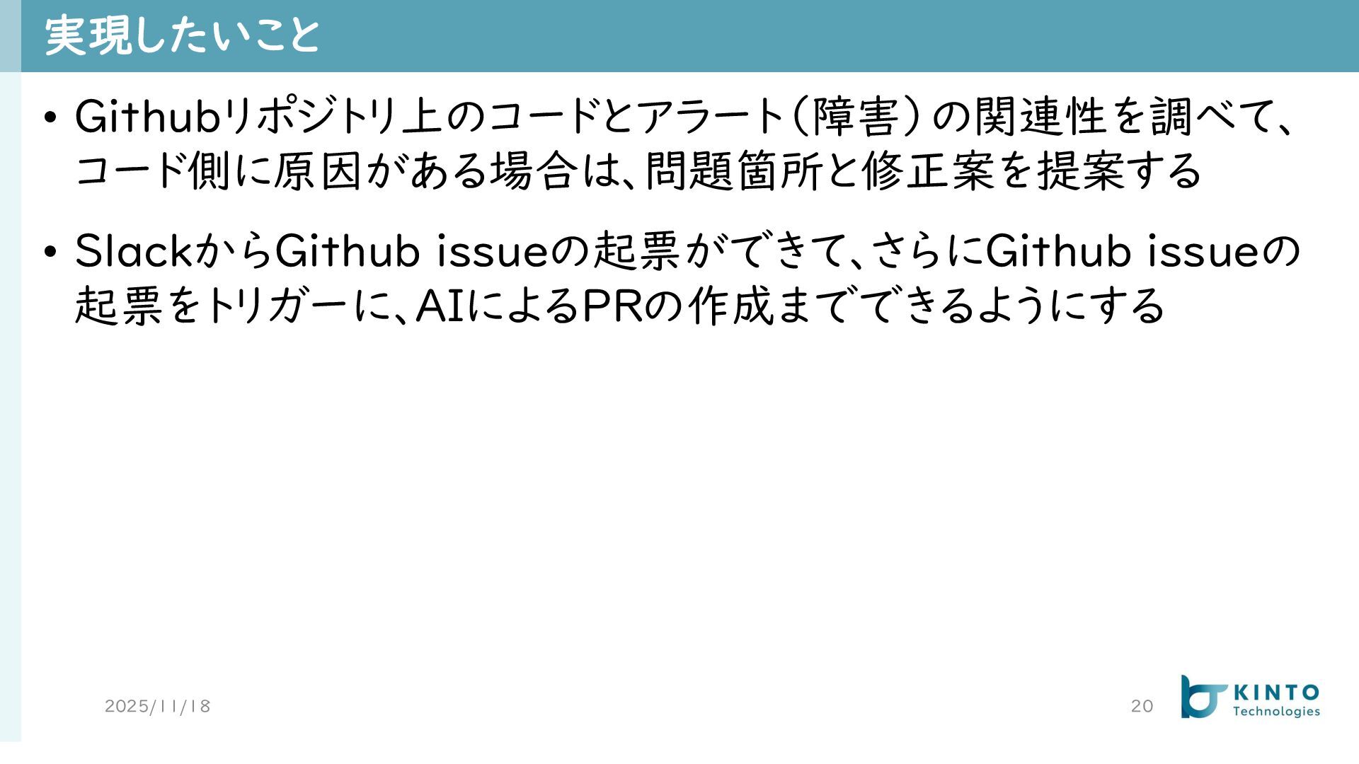 実現したいこと 2025/11/18 20 • Githubリポジトリ上のコードとアラート(障害)の関連性を調べて、 コード側に原因がある場合は、問題箇所と修正案を提案する • SlackからGithub issueの起票ができて、さらにGithub issueの