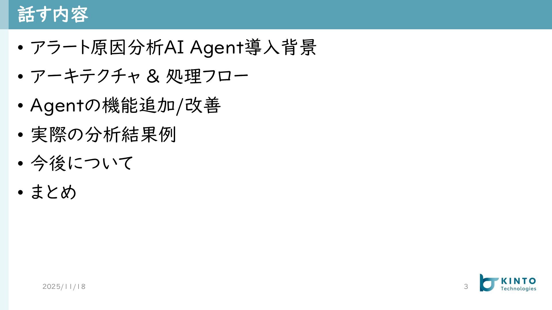 話す内容 2025/11/18 3 • アラート原因分析AI Agent導入背景 • アーキテクチャ & 処理フロー
