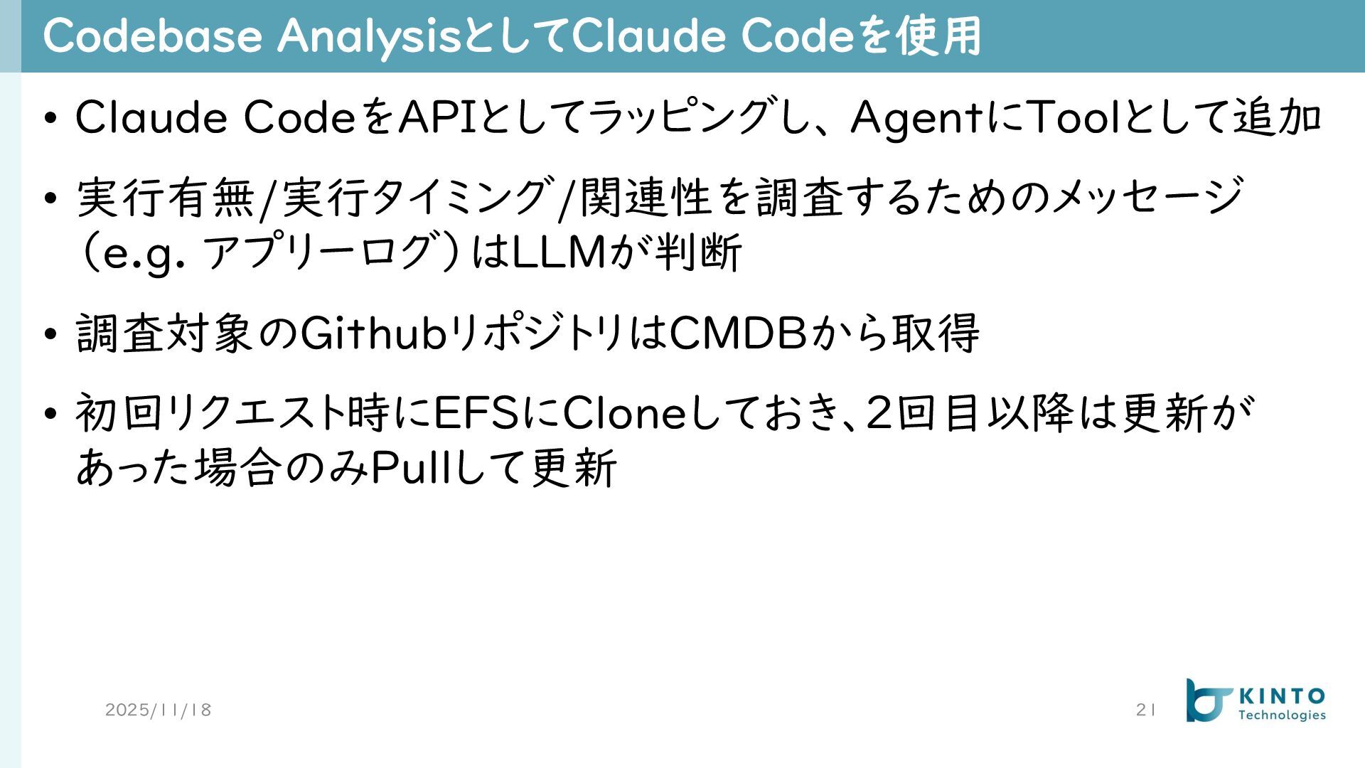 Codebase AnalysisとしてClaude Codeを使用 2025/11/18 21 • Claude CodeをAPIとしてラッピングし、 AgentにToolとして追加 •