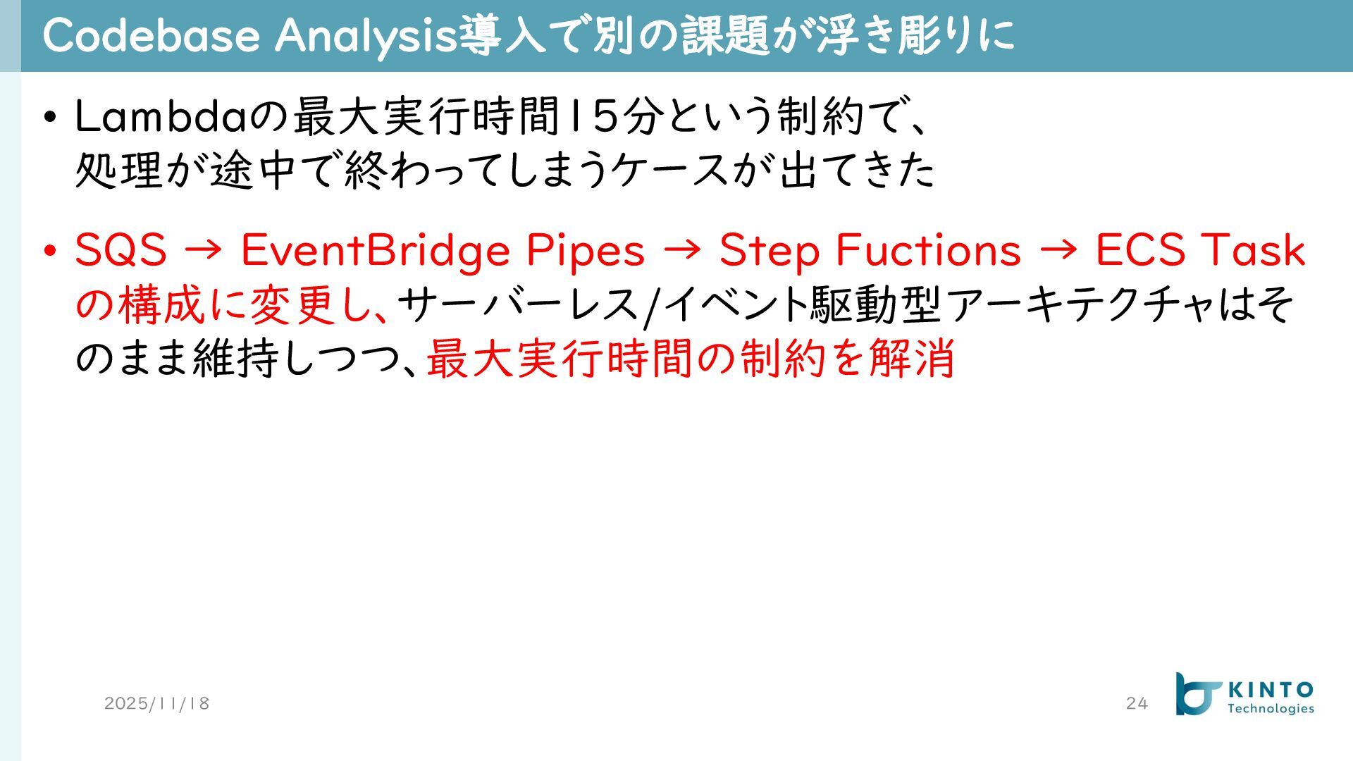 Codebase Analysis導入で別の課題が浮き彫りに 2025/11/18 24 • Lambdaの最大実行時間15分という制約で、 処理が途中で終わってしまうケースが出てきた • SQS →