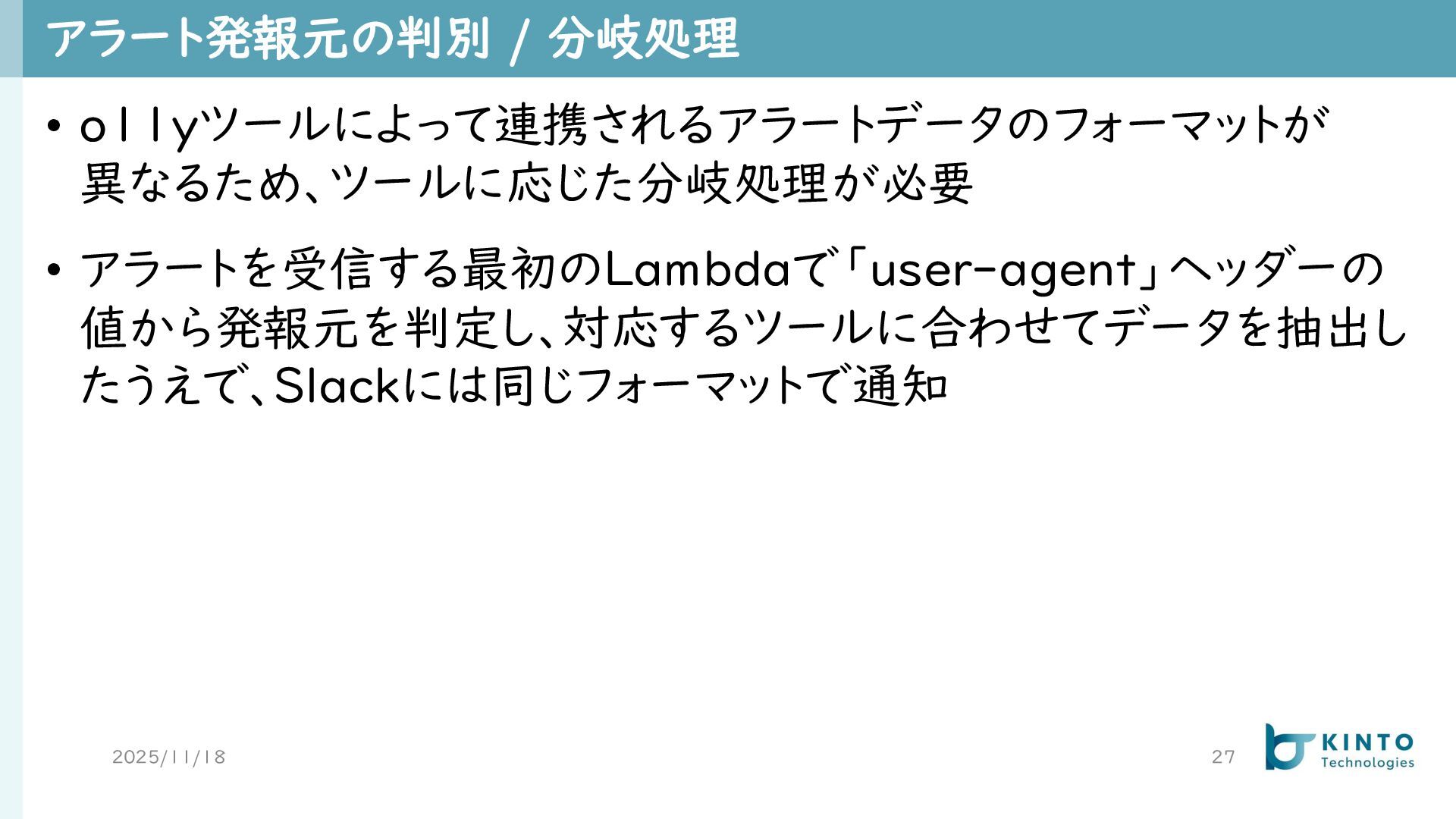 アラート発報元の判別 / 分岐処理 2025/11/18 27 • o11yツールによって連携されるアラートデータのフォーマットが 異なるため、ツールに応じた分岐処理が必要 • アラートを受信する最初のLambdaで「user-agent」ヘッダーの