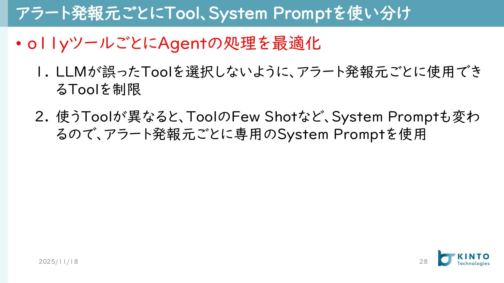 アラート発報元ごとにTool、System Promptを使い分け 2025/11/18 28 • o11yツールごとにAgentの処理を最適化 1. LLMが誤ったToolを選択しないように、アラート発報元ごとに使用でき るToolを制限 2.