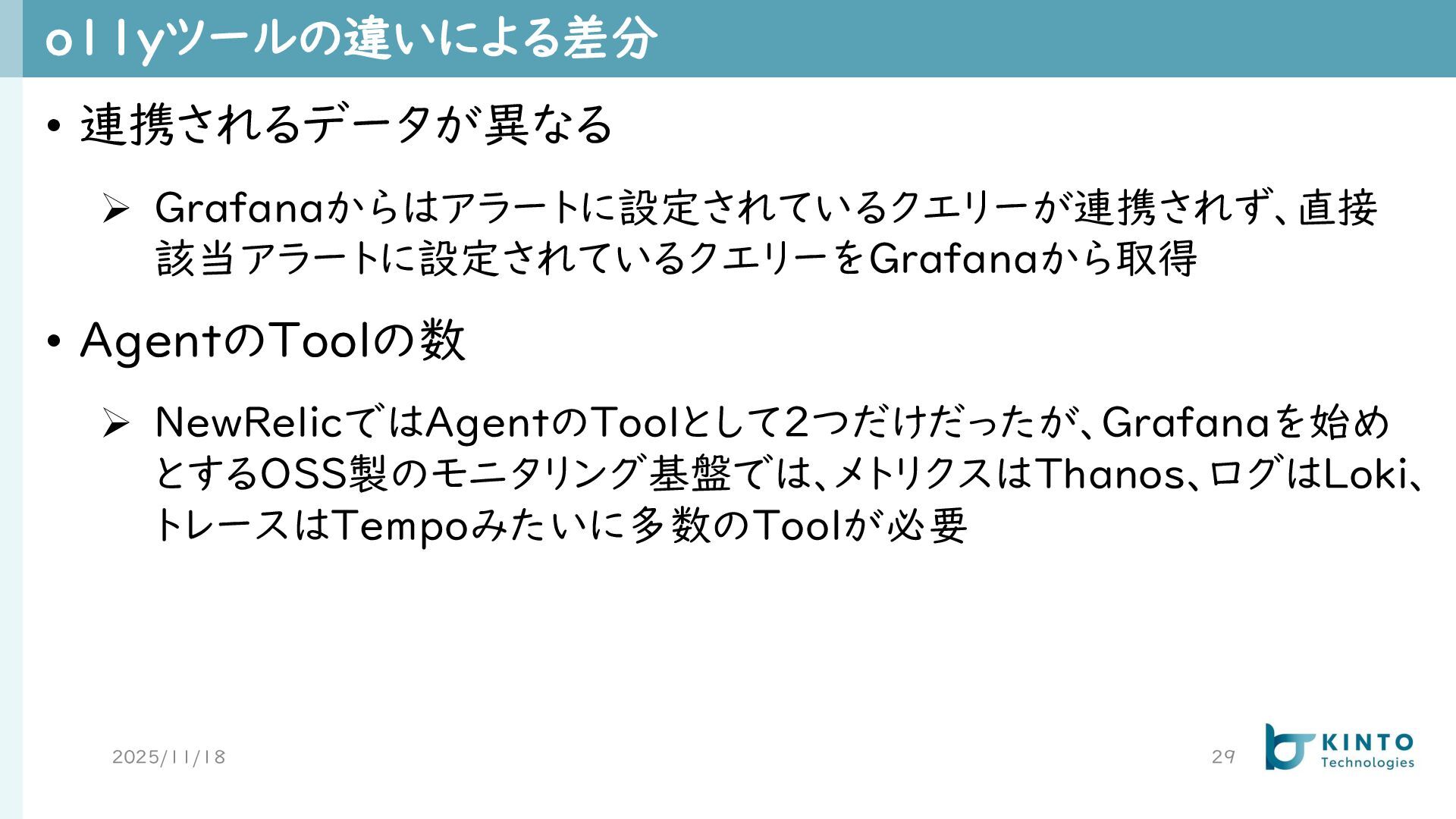 o11yツールの違いによる差分 2025/11/18 29 • 連携されるデータが異なる ➢ Grafanaからはアラートに設定されているクエリーが連携されず、直接 該当アラートに設定されているクエリーをGrafanaから取得 • AgentのToolの数