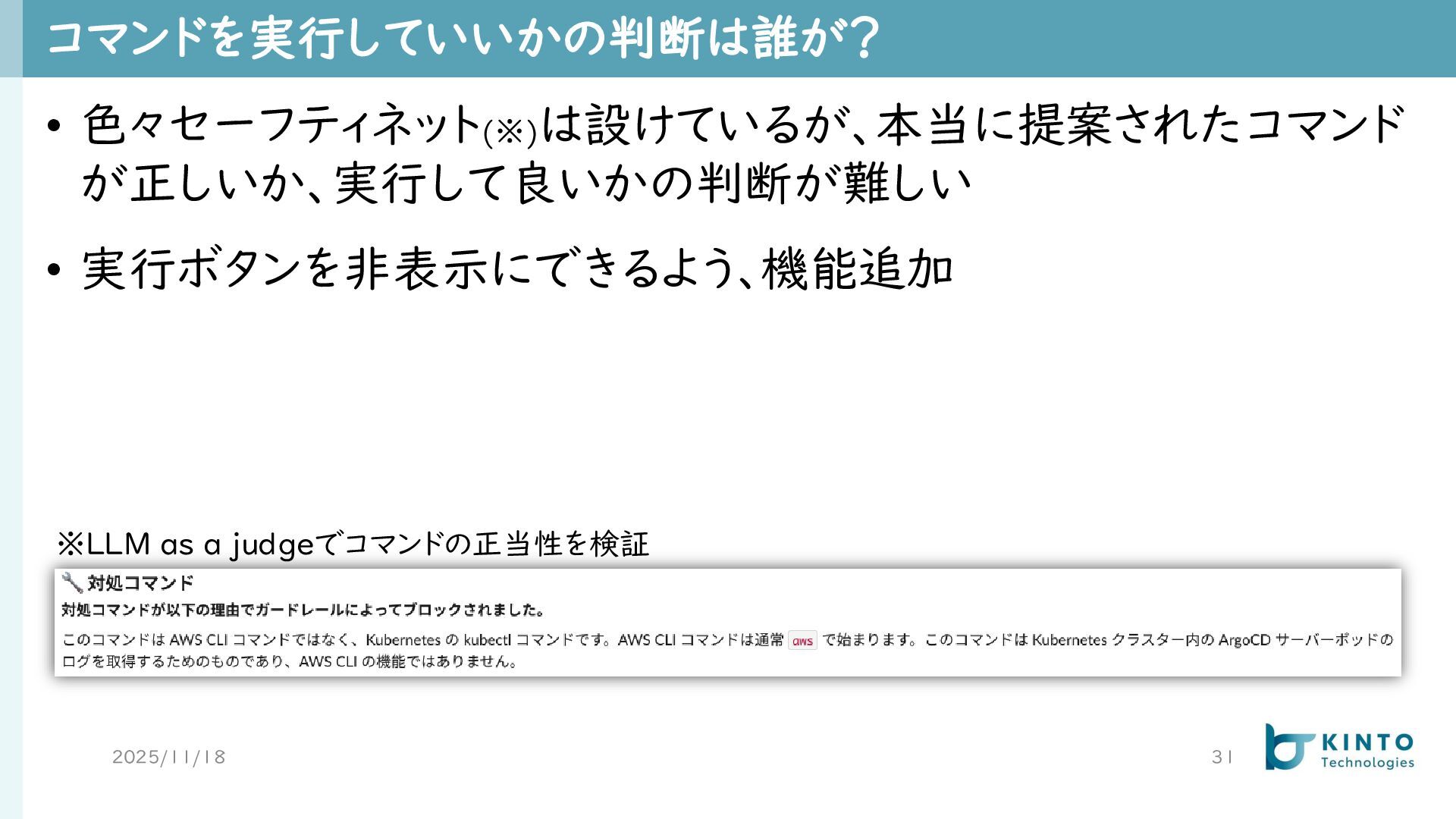 コマンドを実行していいかの判断は誰が? 2025/11/18 31 • 色々セーフティネット(※) は設けているが、本当に提案されたコマンド が正しいか、実行して良いかの判断が難しい • 実行ボタンを非表示にできるよう、機能追加 ※LLM