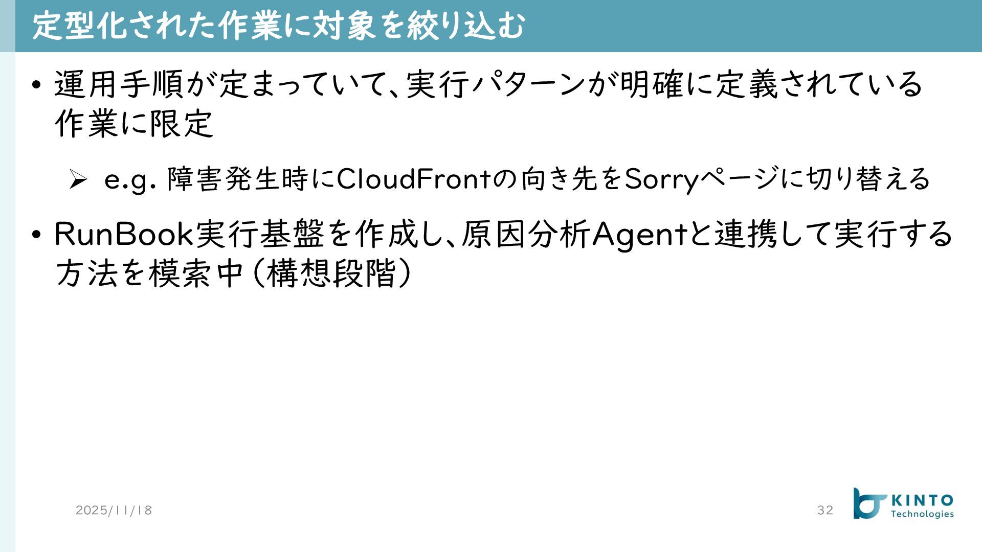 定型化された作業に対象を絞り込む 2025/11/18 32 • 運用手順が定まっていて、実行パターンが明確に定義されている 作業に限定 ➢ e.g. 障害発生時にCloudFrontの向き先をSorryページに切り替える •